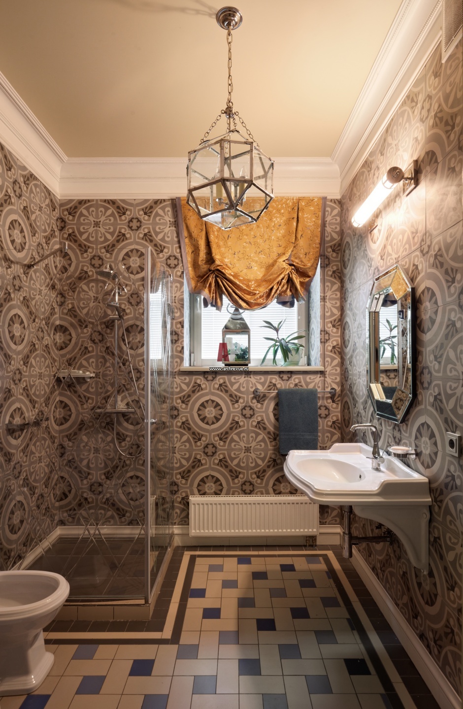 Интерьер санузла отделан плиткой с этническим орнаментом.