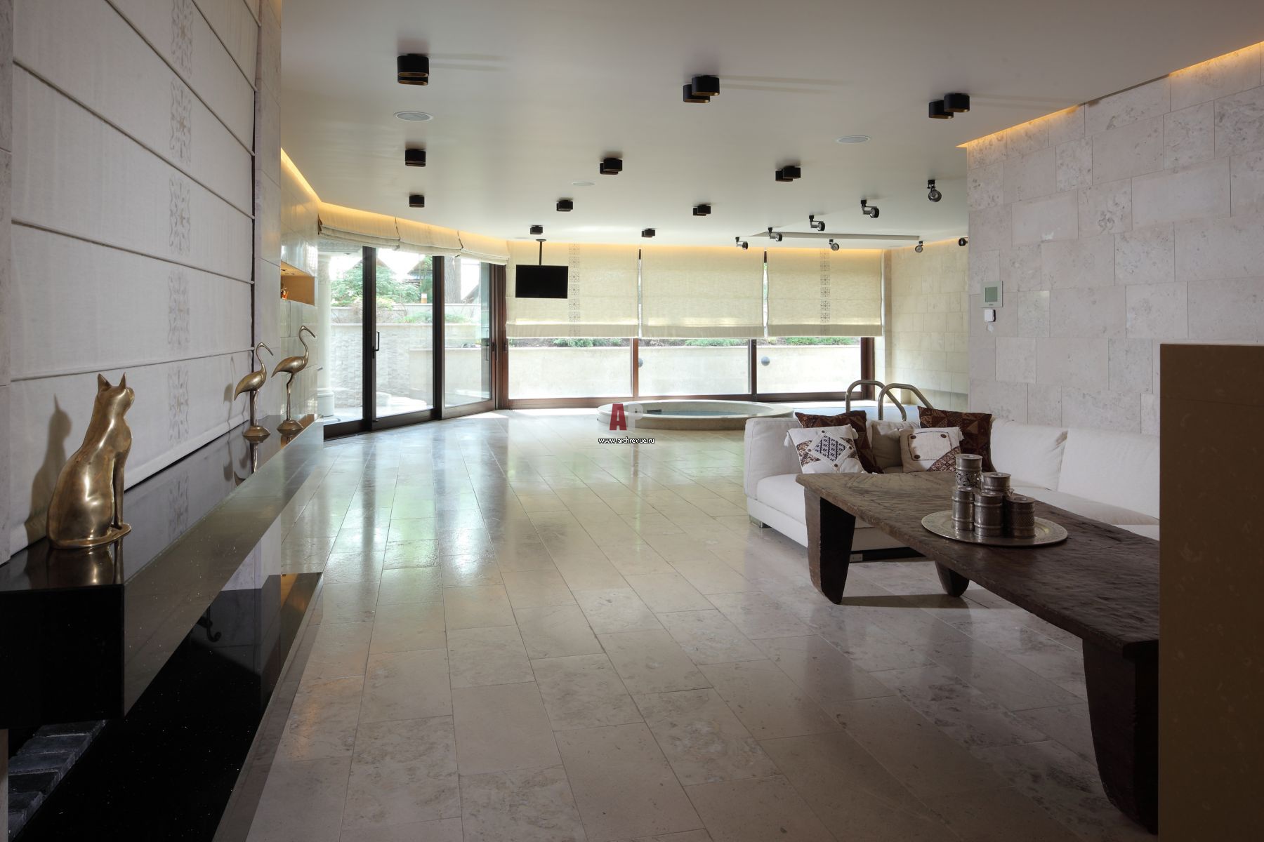 Полы и стены в зоне бассейна облицованы плитами доломита, поставщик «Лаборатория Камня».