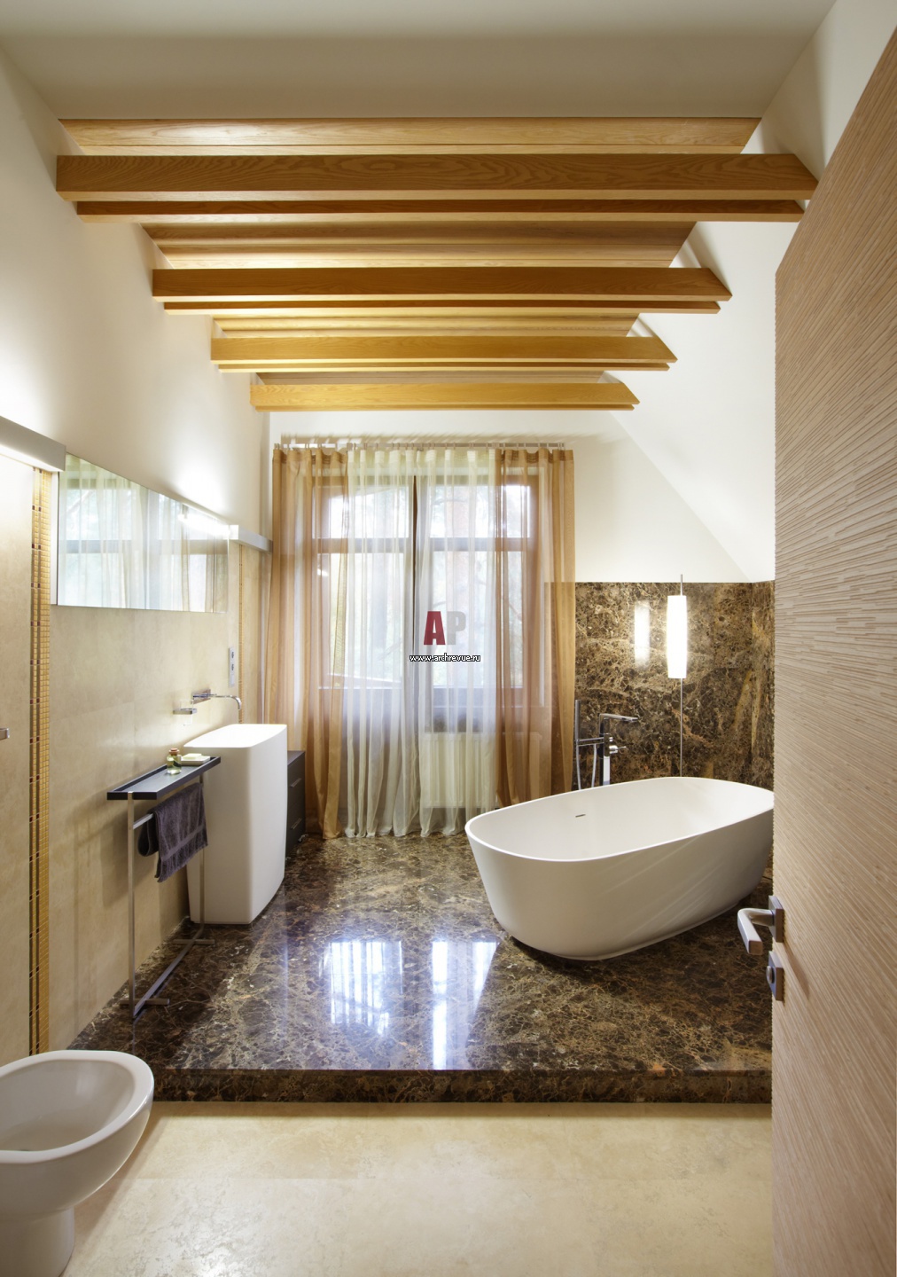 Интерьер ванной комнаты в эко-стиле. Ванна поставлена в центре помещения на мраморный подиум. Потолок украшен балками из ясеня.