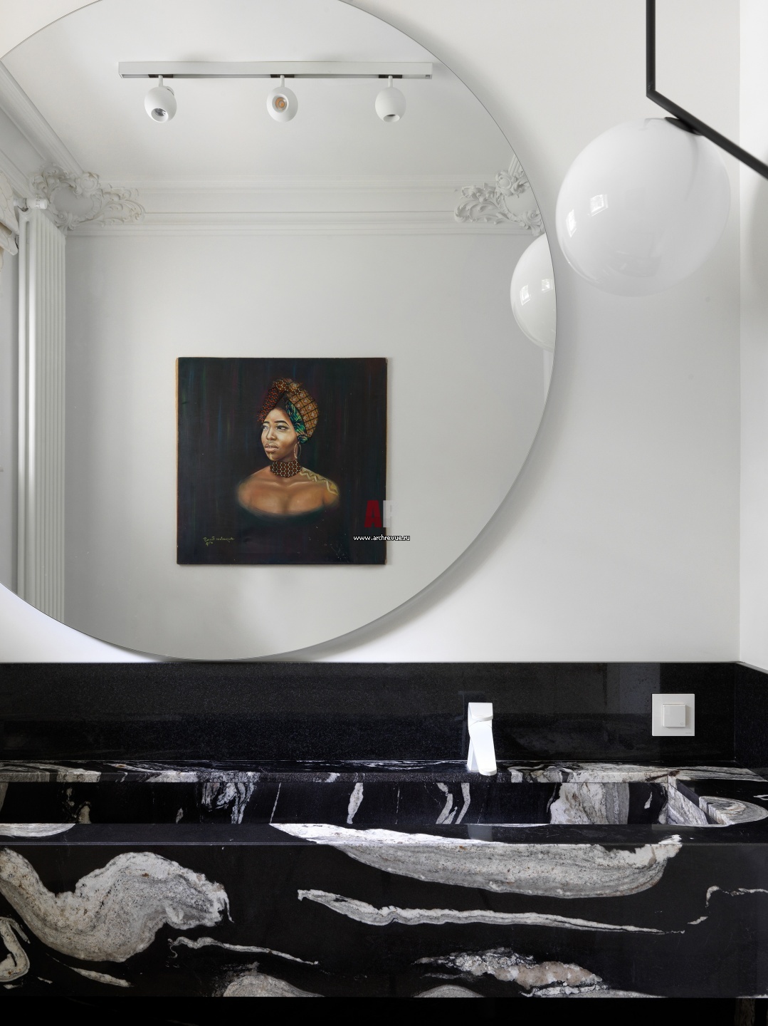 Гостевой санузел первого этажа. Украшение помещения – раковина, выполненная под заказ по чертежам дизайнера из черного кварцита с серыми прожилками. В отличие от мрамора кварцит не боится воды и отлично подходит для мокрых зон. Смесители, Cisal. В зеркале отражается картина нигерийского художника Питера Промиса. Светильники, Flos, по дизайну Микаэля Анастасиадиса. Трековые светильники, Centrsvet.