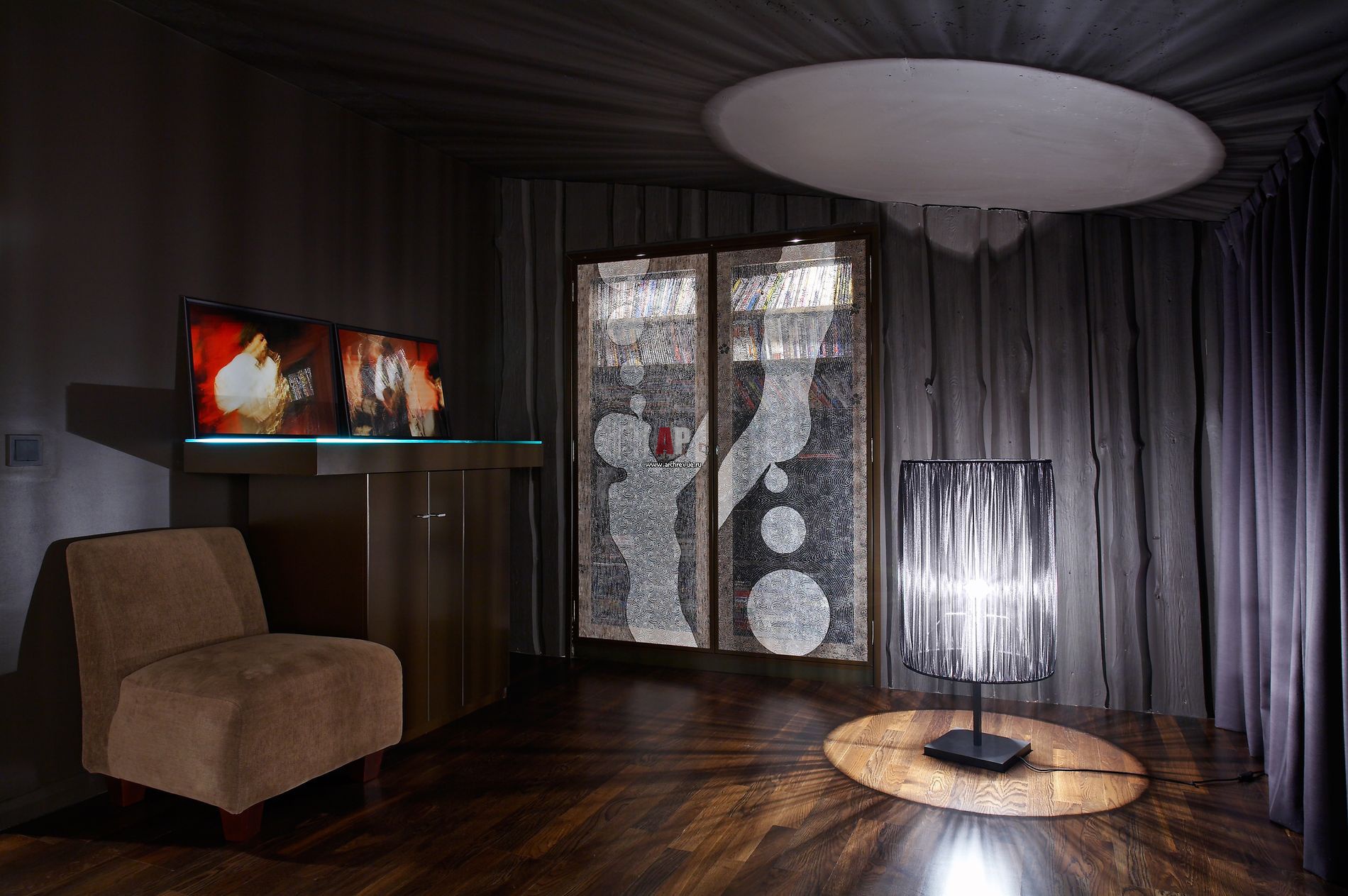 Домашний кинотеатр разместился на втором уровне, под скатом крыши. Лампа, созданная дизайнерами компании «Геометрия» выглядит как арт-объект. Оригинально смотрится и шкаф. Его дверцы – панели, на которые натянуто кружево с рисунками, созданными художниками-авангардистами.