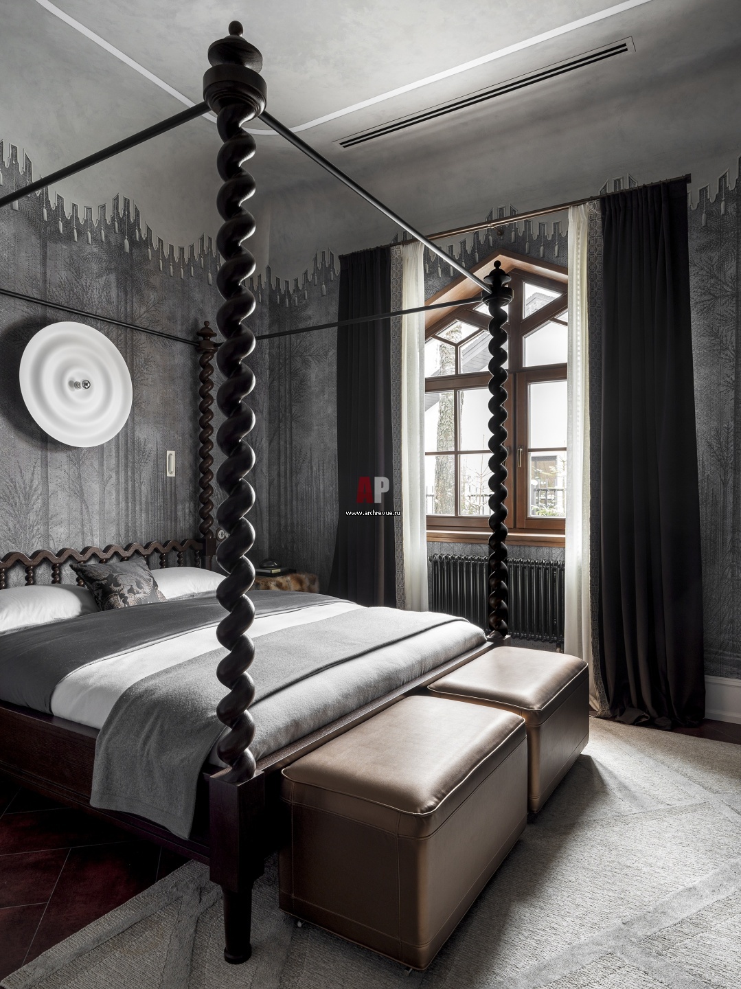 Хозяйская спальня выполнена в черно-белой цветовой гамме. Резная кровать и меховые тумбы изготовлены на заказ. Обои, Glamora.