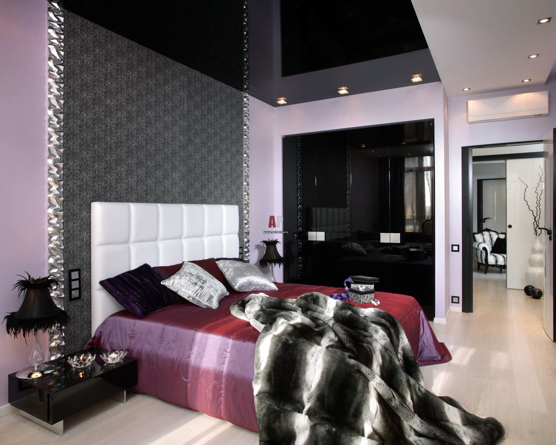 Спальня в фиолетово-сиреневой цветовой гамме. Шкаф с глянцевыми фасадами итальянской компании Gruppo FEG. Прикроватные тумбочки, vVaraschin.