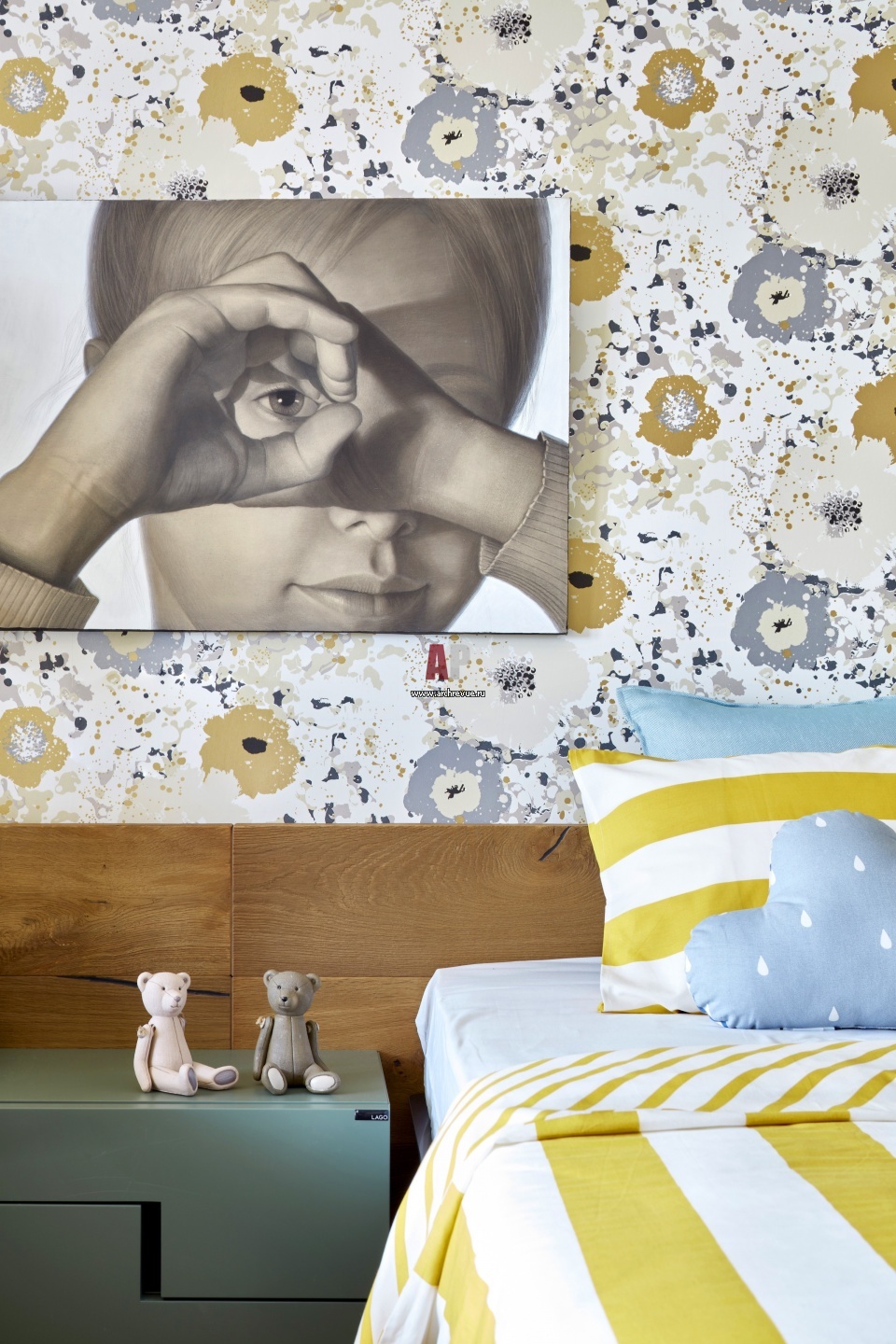 Интерьер детской в семейной квартире. Обои серо-горчичного цвета, York Wallcoverings.