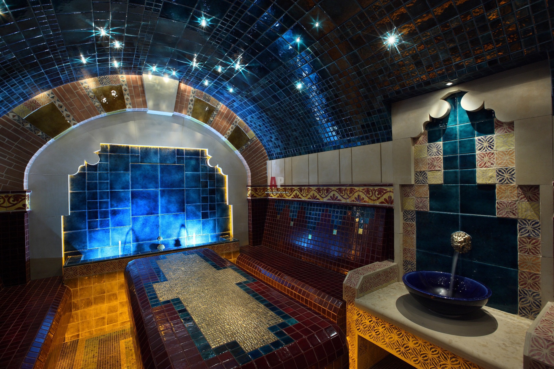 Хаммам оформлен оригинальной плиткой глубоких оттенков. Она выполнена не из керамики, а из базальта и выглядит, как будто покрыта глазурью. Созданию эффекта сияния служит точечная подсветка с использованием хрусталя Сваровски. Строительство и монтаж - компания ««СаунаСтройСервис»»