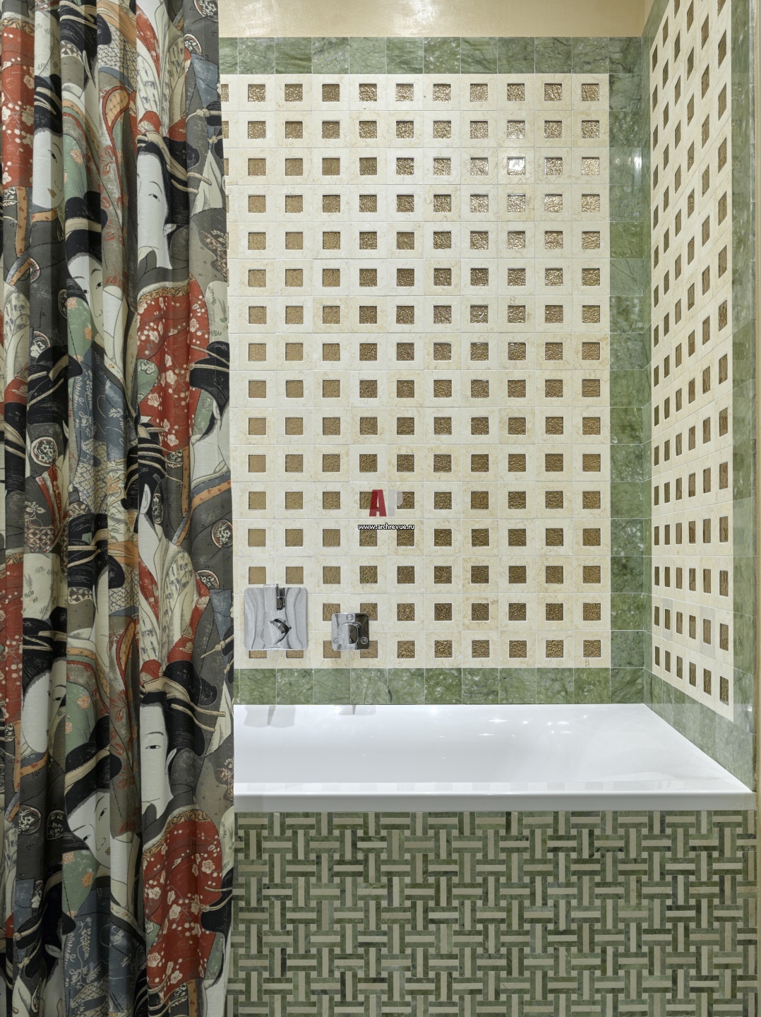 Интерьер ванной комнаты в восточном стиле. Стена и передний фасад ванны облицованы каменной мозаикой бежевого и нефритового цветов. Сантехника, Villeroy & Boch.