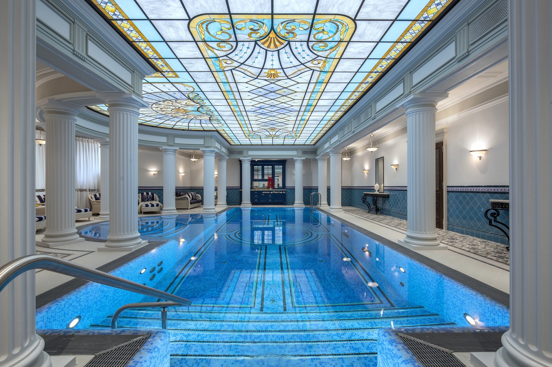 Классический трехэтажный особняк с подземными уровнями в центре Санкт-Петербурга. Бассейн в цоколе. Потолок бассейна оформлен художественным витражом, который работает как световой фонарь. Проектирование витража, Olga Kushnareva-Leone Architecture&Design.