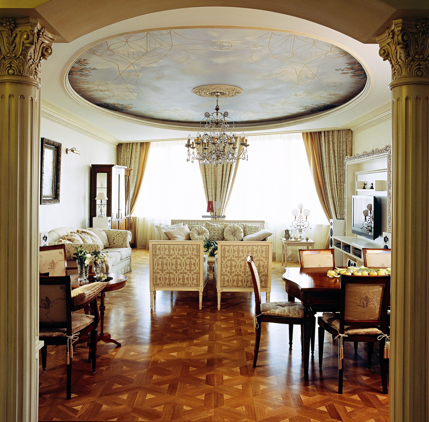 Из холла открывается вид на арку в обрамлении классических колонн, которая предваряет вход в открытое пространство гостиной. Изделия из дерева, по чертежам архитектора, Martini Mobili.