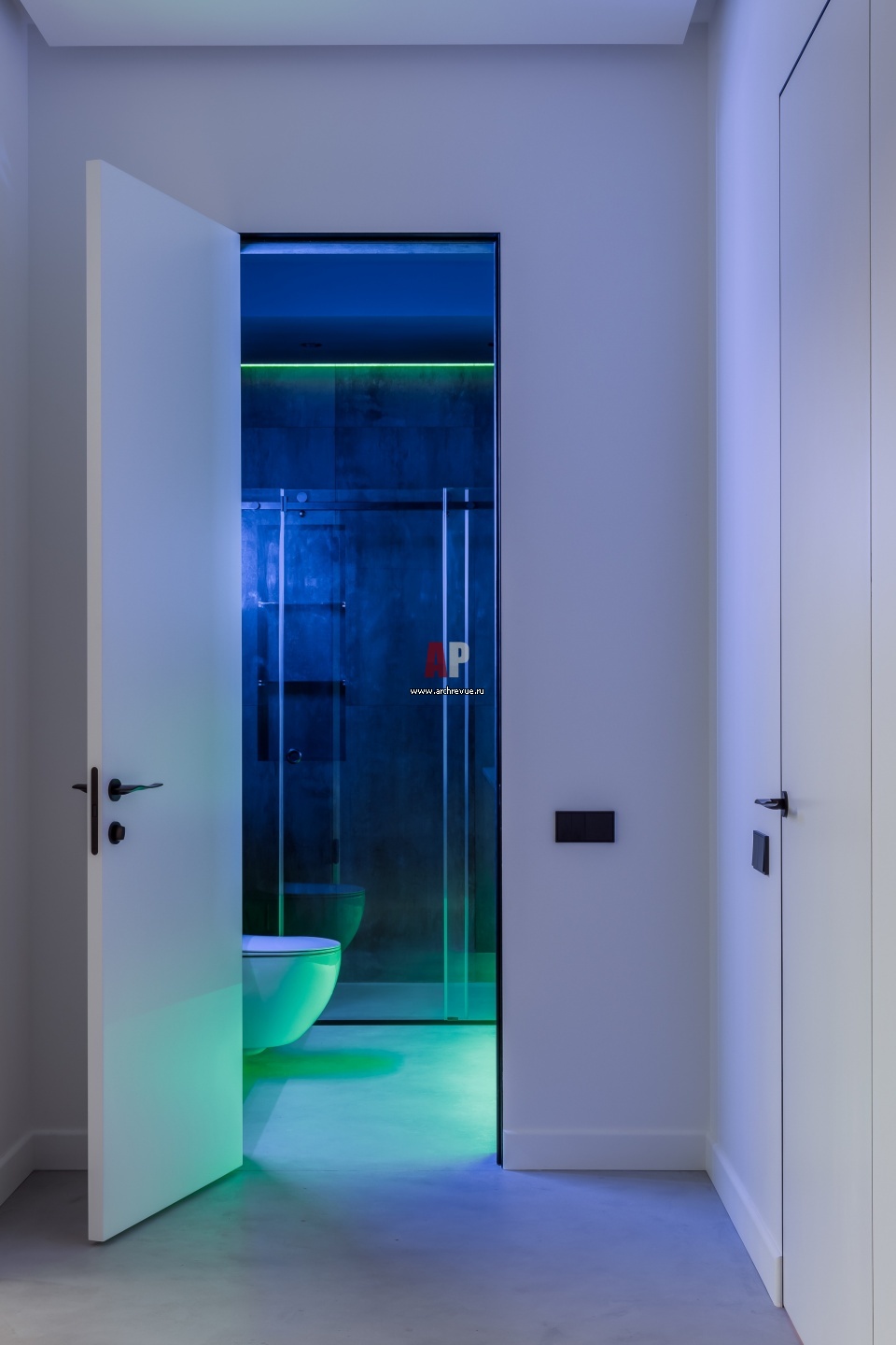 Барнхаус в Краснодарском крае. Вид на санузел из белого коридора.
