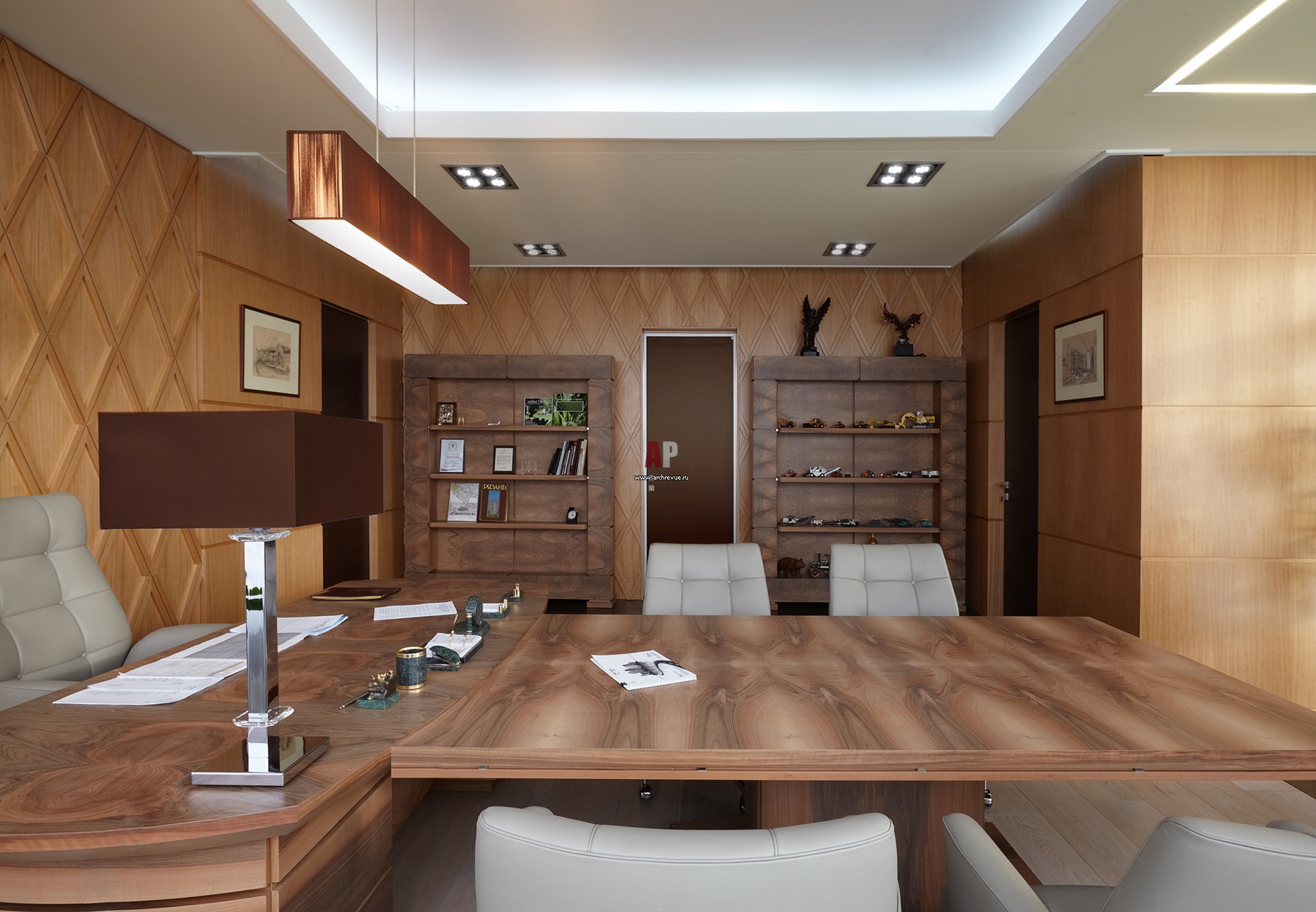 Фото интерьера офиса в стиле ар-деко. В основе декоративного решения интерьера – разная фактура дерева.
