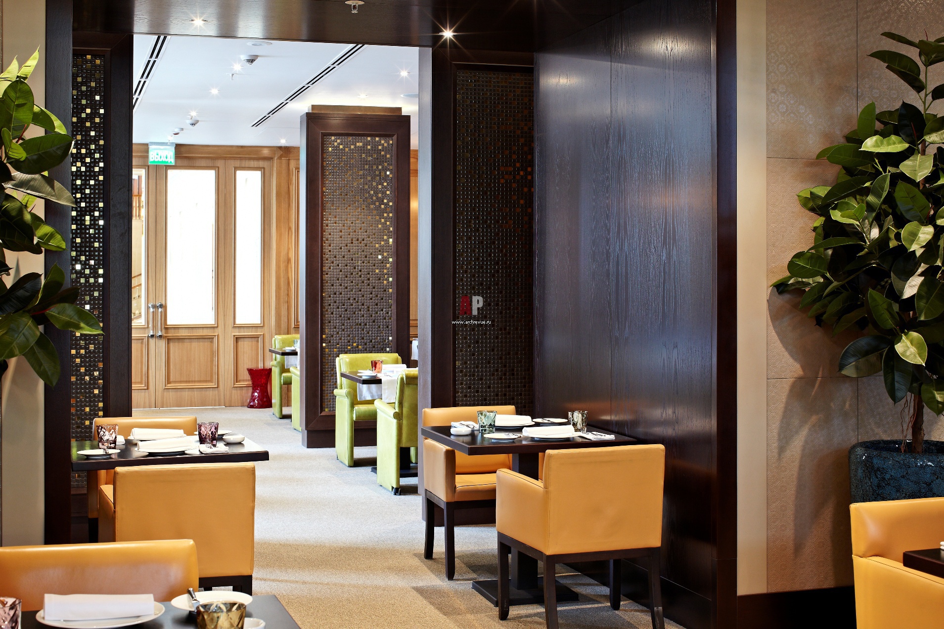 Облик ресторана формируют элегантные отделки: дерево, мозаика, натуральная кожа.