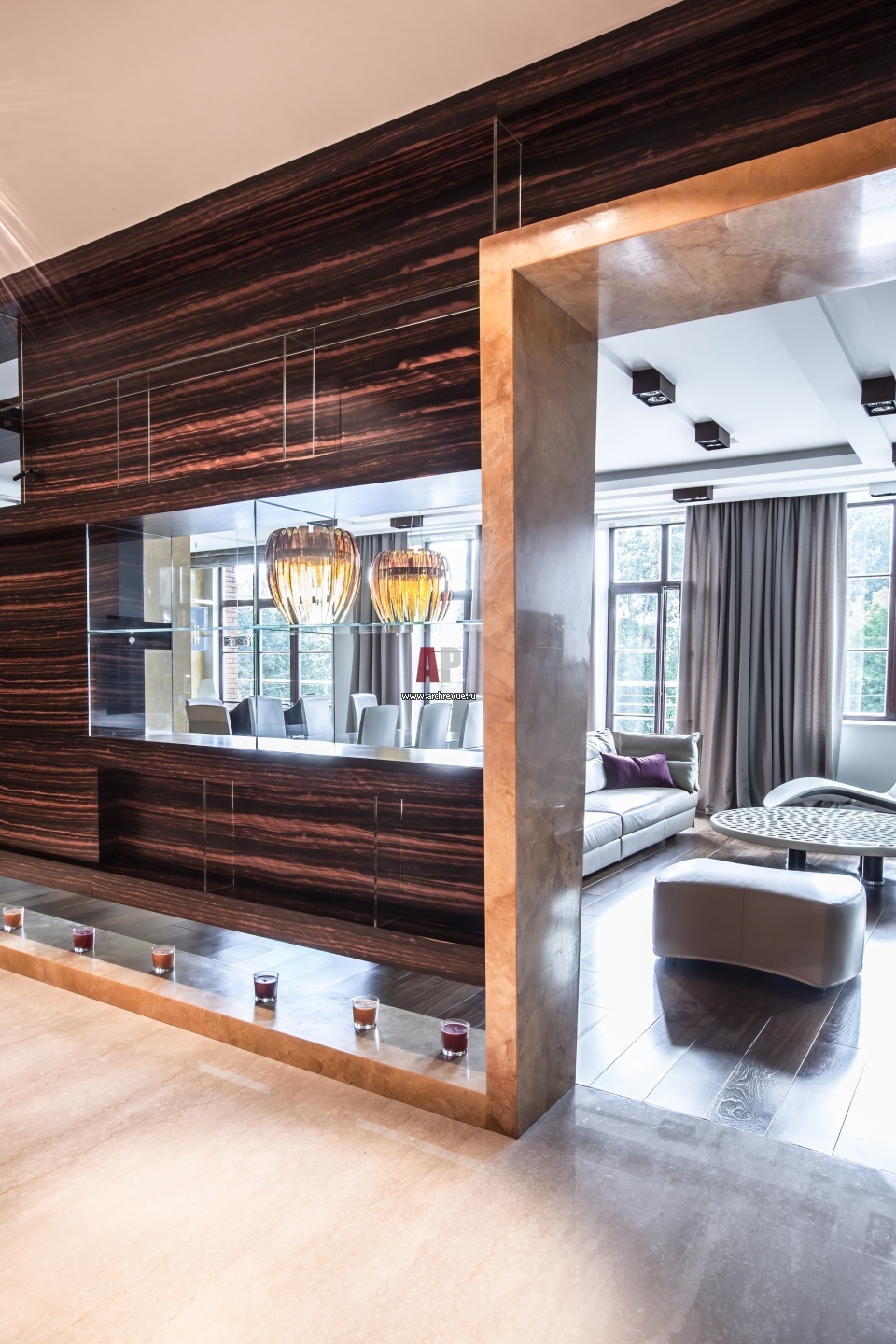 Интерьер квартиры выдержан в природных земляных тонах с использованием дорогих материалов с роскошной фактурой: мрамора, американского ореха (на полу), эбенового дерева.