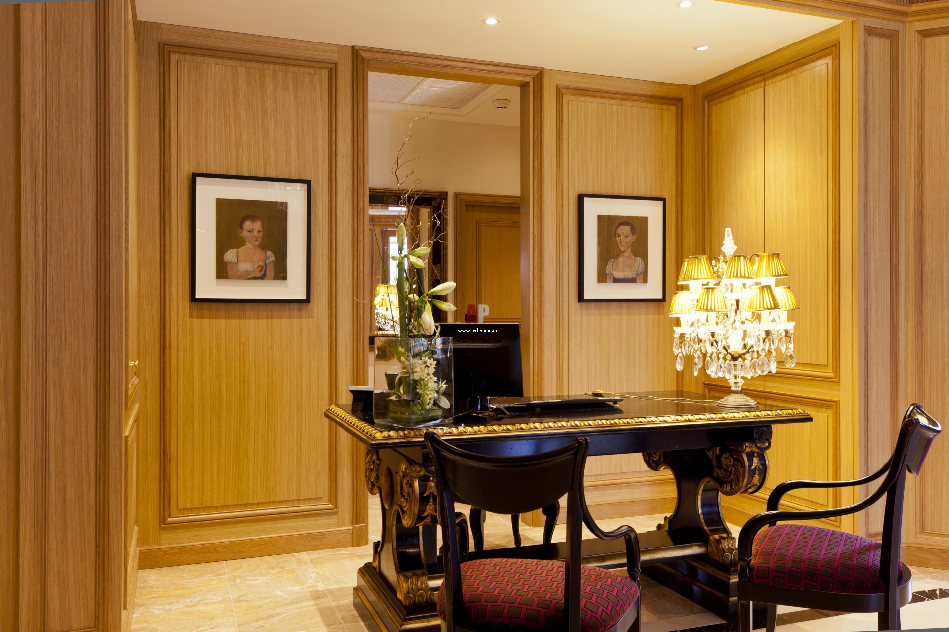 В бутик-отеле нет ресепшена в привычном понимании этого слова. Его заменяет резкой столик в классическом стиле из лакированного дерева с позолотой.