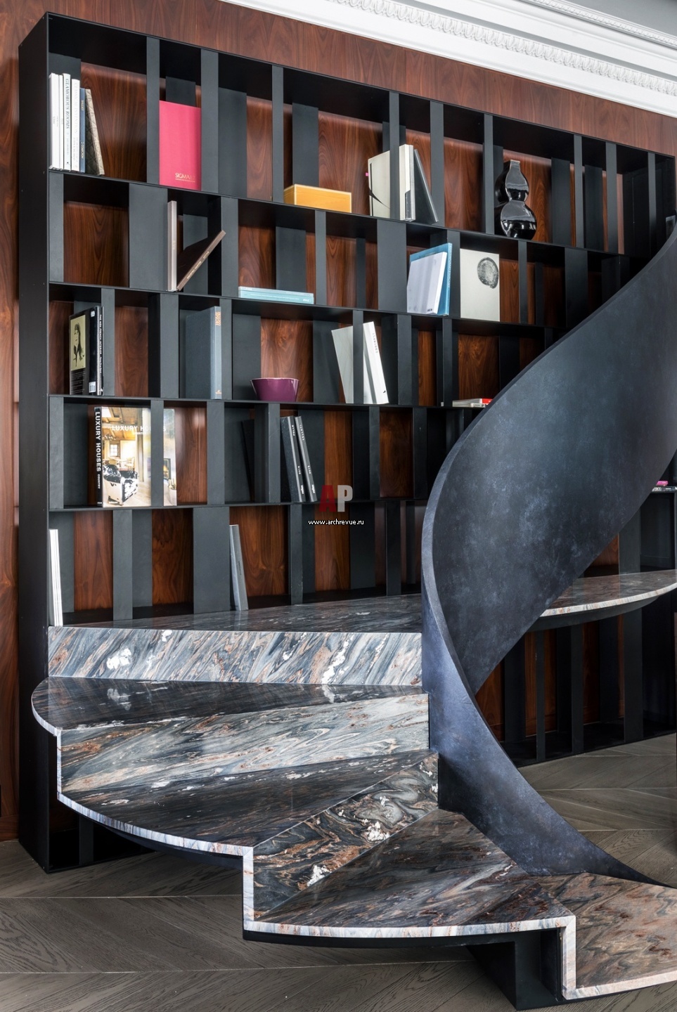 Композиция библиотеки. Радиусная лестница с каменными ступенями эффектно выглядит и позволяет легко достать до каждой полки.