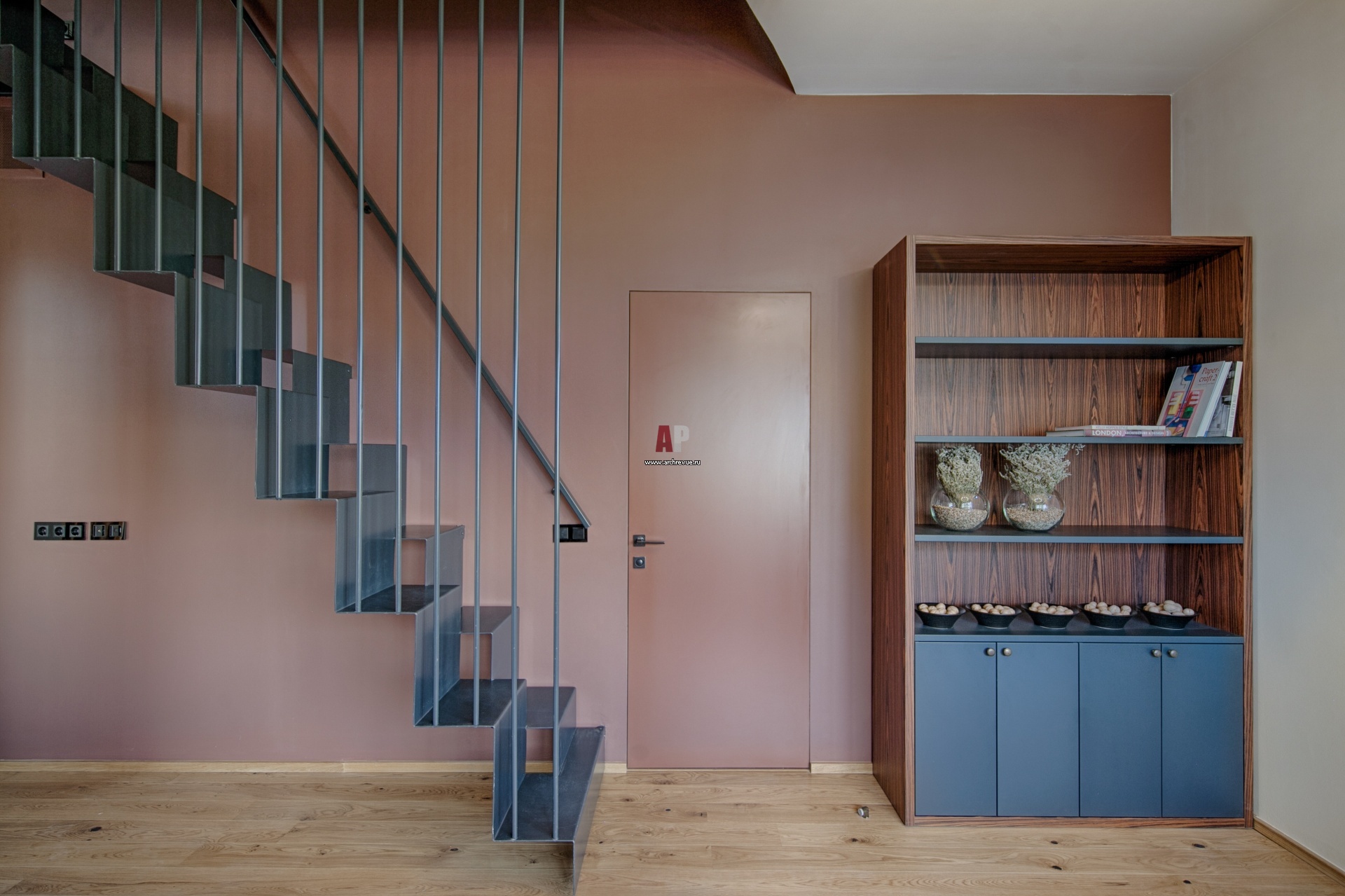 Из-за необычной архитектуры здания вторая детская изначально имела сложную линию кровли и была двусветной. В новом интерьере ее сделали более функциональной: часть пространства под крышей зашили деревом и обустроили небольшую отдельную гардеробную, куда ведет металлическая лестница. Деревянный пол-потолок усилили жестким каркасом, переходящим в лестничные ограждения.