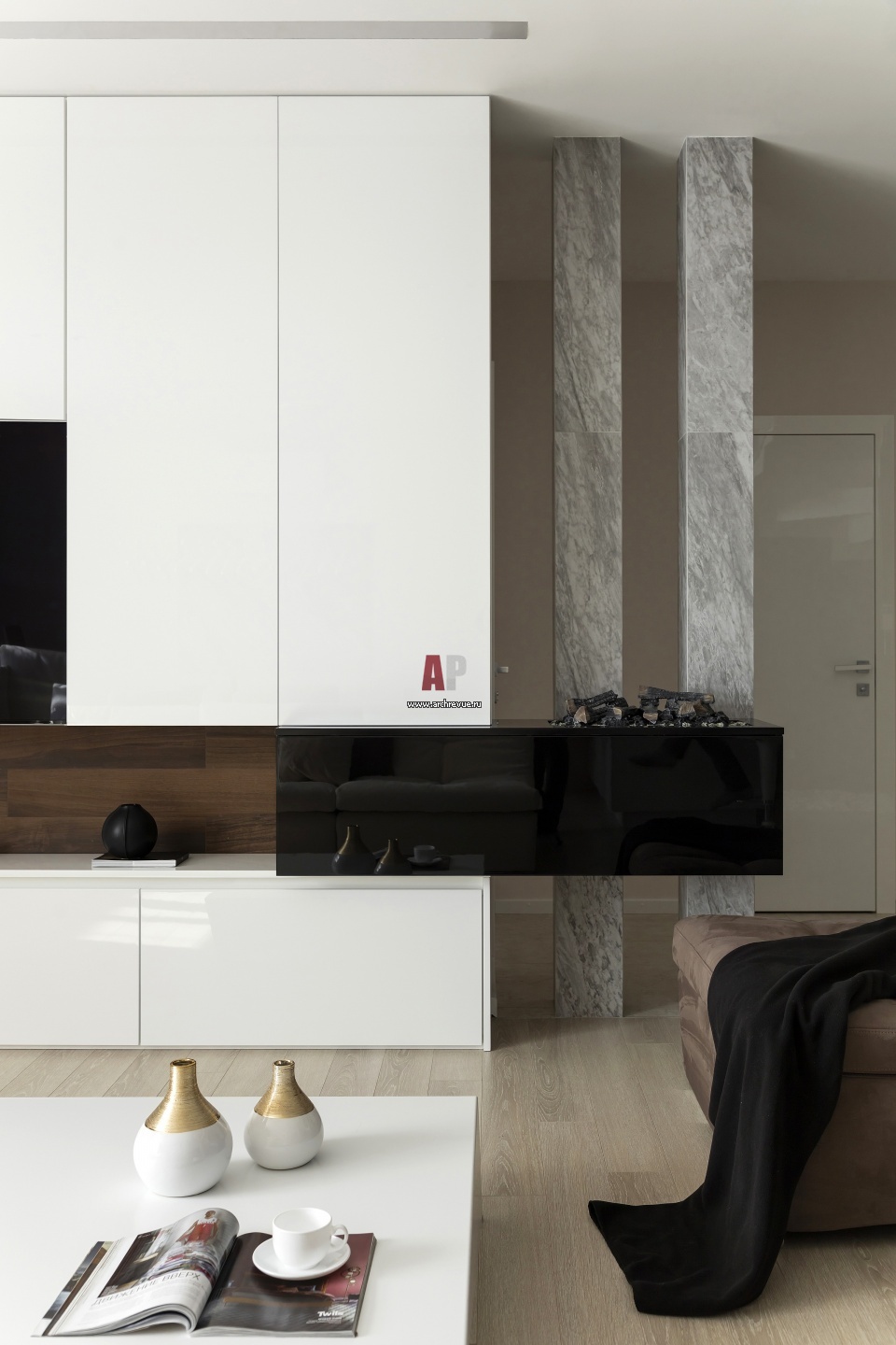 Система хранения из белого лака переходит в подвесную консоль с паровым камином. Колонны за ним отделаны керамогранитом под камень.