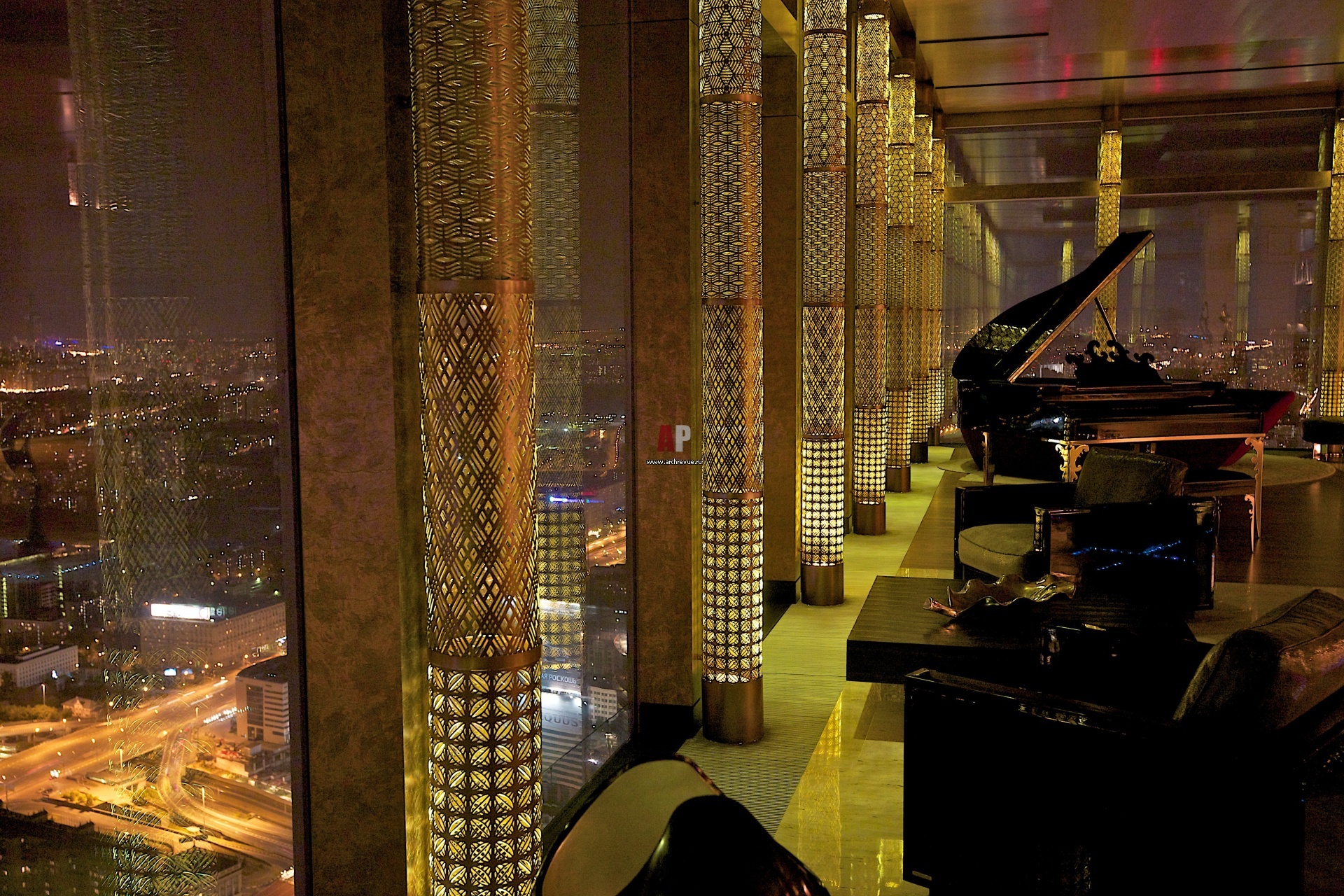 Переплеты панорамных окон оформлены перфорированными светильниками из металла, они дают красивые тени.