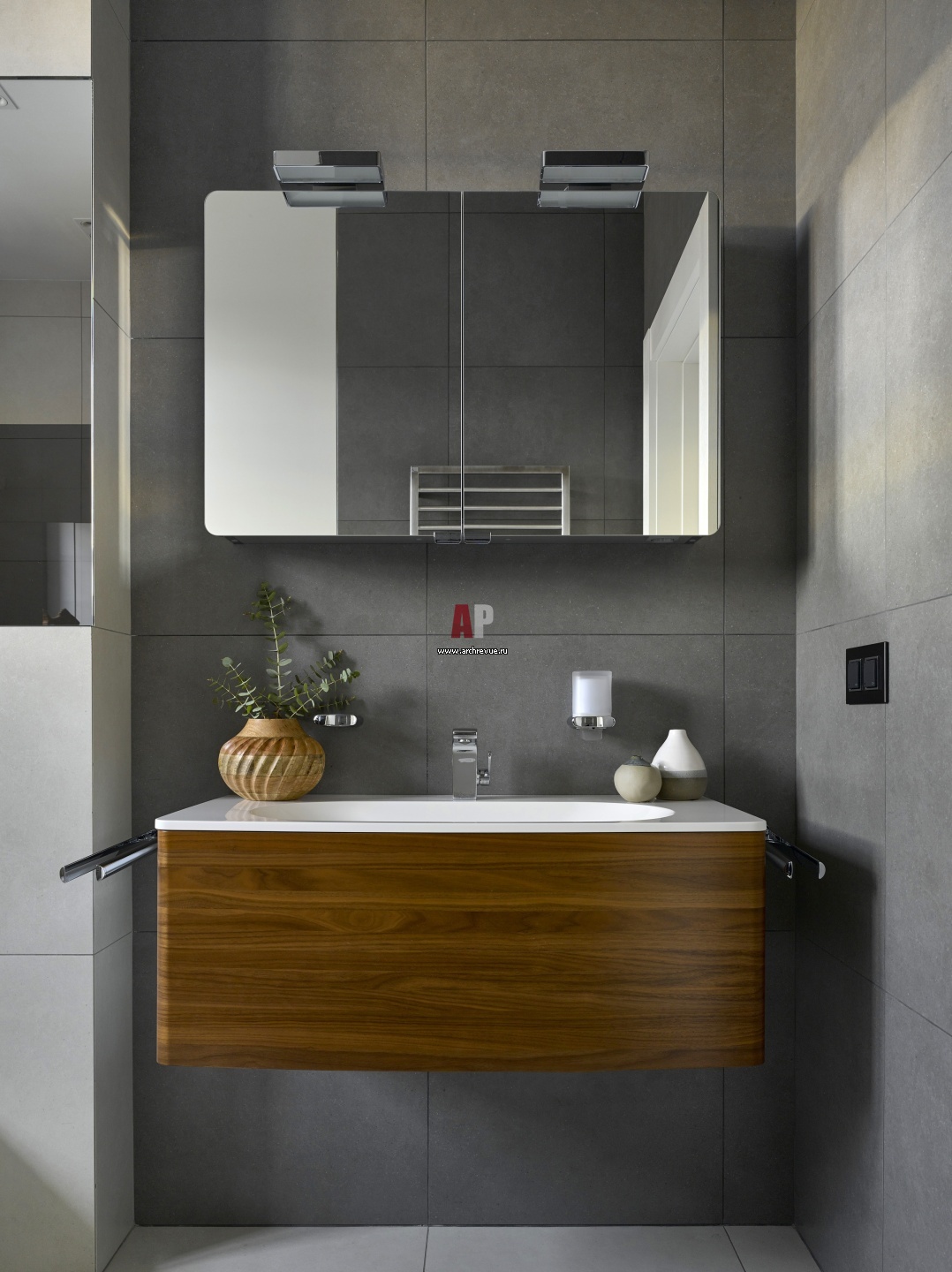 Гостевой санузел выполнен в стилистке основного интерьера. Стены облицованы керамогранитом графитного оттенка с шероховатой текстурой. Тумба под раковину деревянная. Сантехника, Keuco.