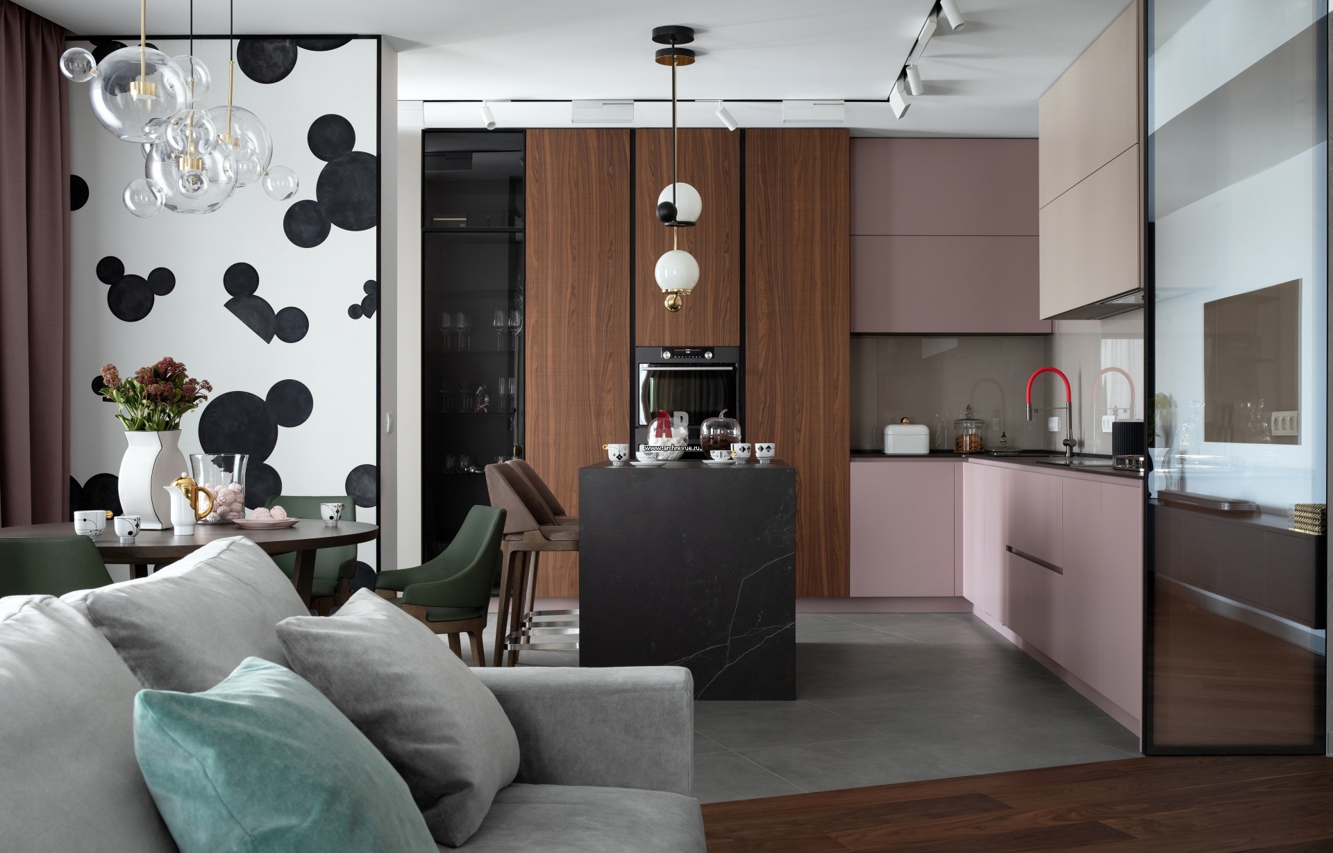 Общая гостиная-кухня. Простенок возле обеденного стола оформлен декоративной штукатуркой по трафарету «Микки-Маусы», Derufa. Кухня в отделке американский орех, Modulnova.