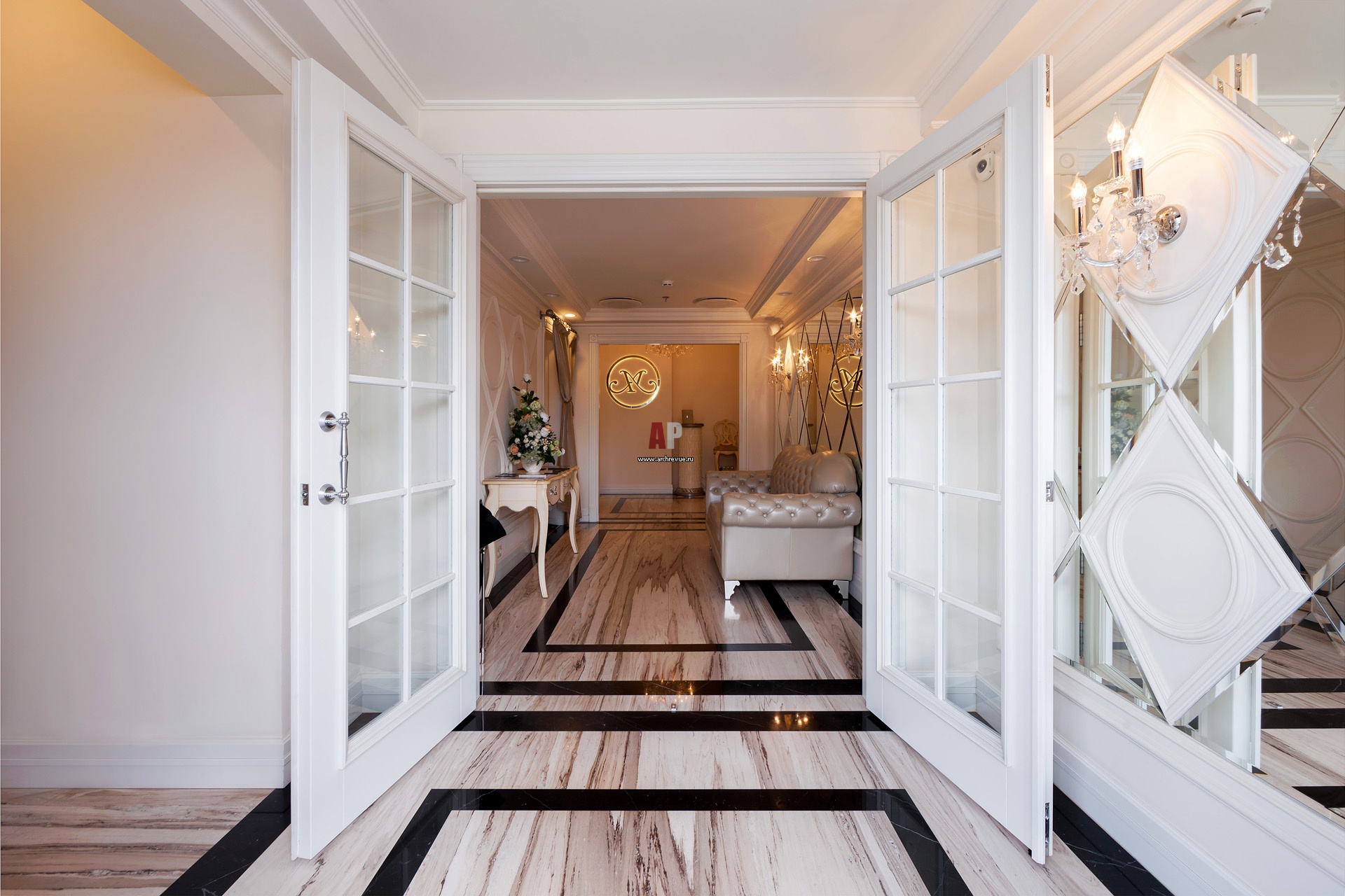 Дизайн входной группы ресторана в классическом стиле. Светлая цветовая гамма создает парадный настрой.