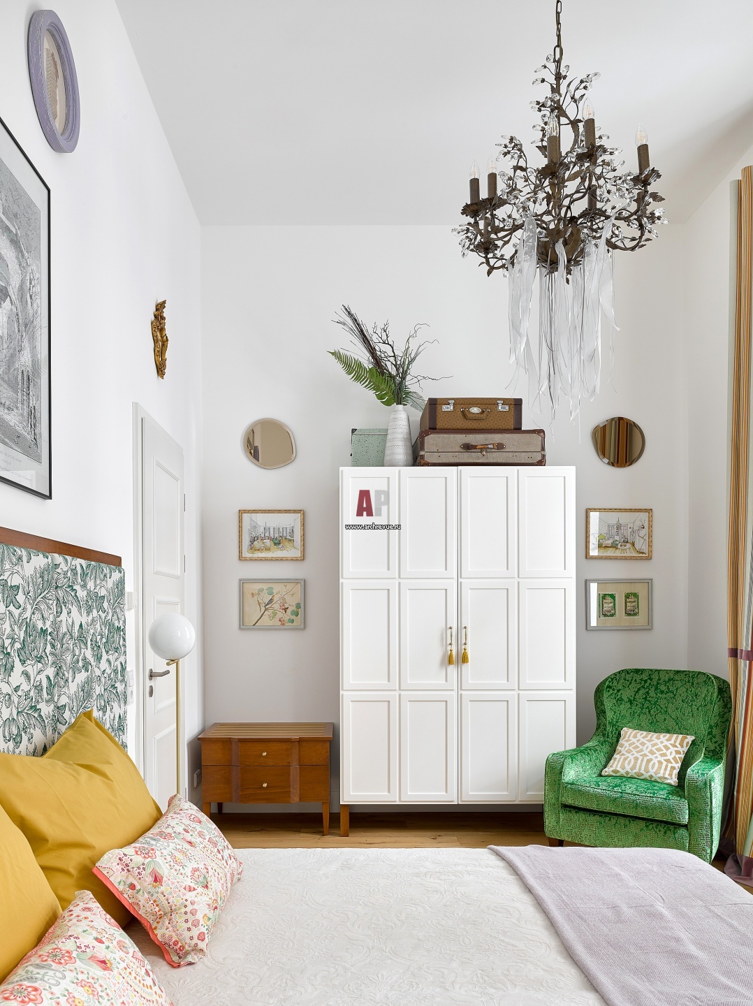 Бутик-апартаменты с двумя спальнями под сдачу в Дюссельдорфе. Интерьер гостевой. Стена за зеленым креслом оформлена вставленными в багет эскизами квартиры.