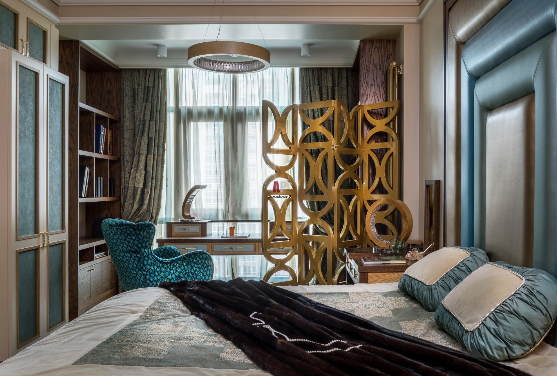 Хозяйская спальня в будуарной стилистке и бирюзовых тонах. Шкафы, стеллажи, бюро, туалетный столик сделаны по чертежам автора проекта. Ширма, Hamilton Conte. Фасады встроенных шкафов оформлены декоративным покрытием с эффектом шелка. А полу – термодуб, поставщик «Мир Паркета».