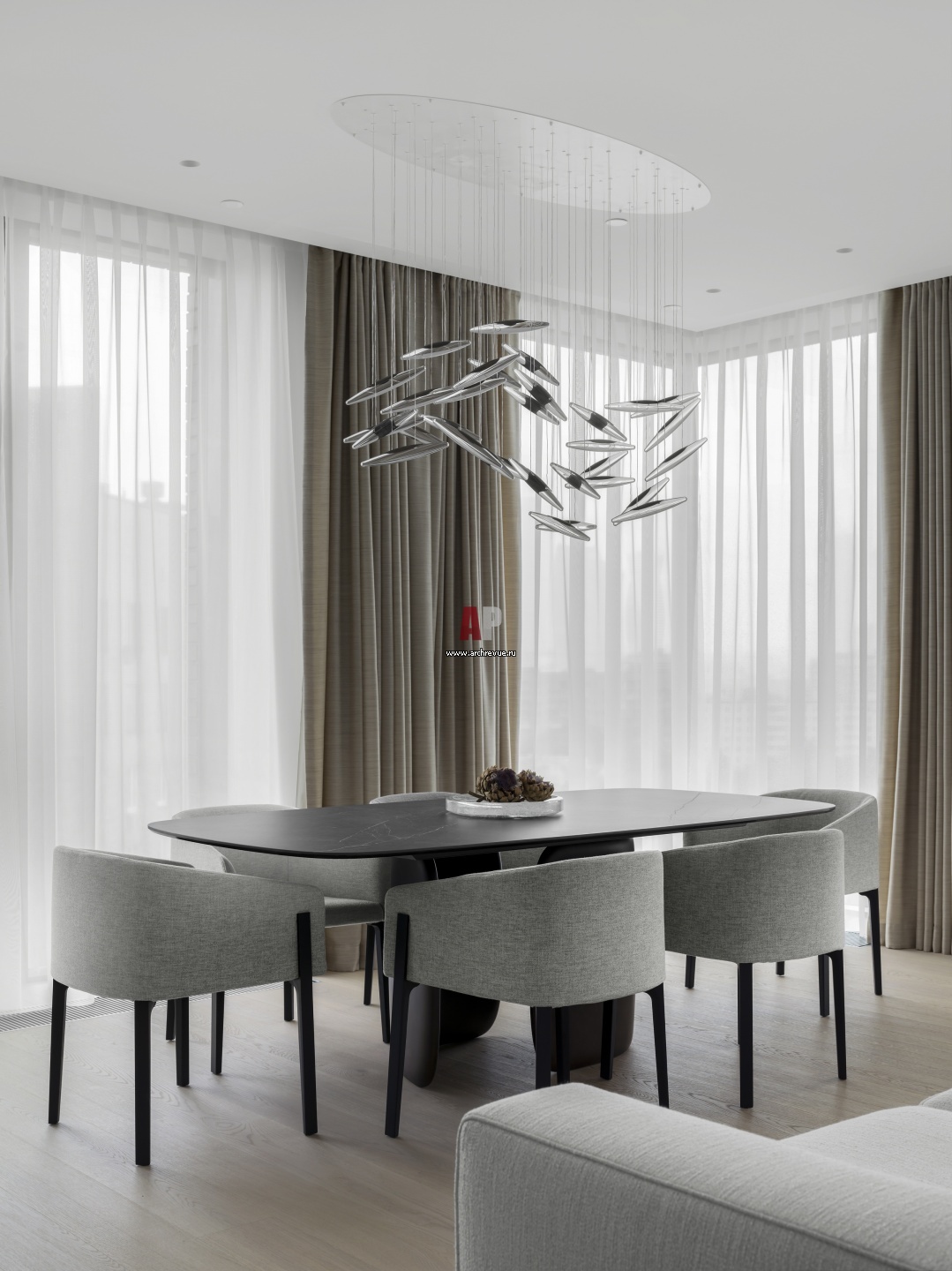Столовая зона в общей гостиной. Стол, Bonaldo, модель Mellow. Стулья, De Padova, модель Chesto. Над столом – воздушная и волнообразная люстра, Ochre, (модель Moonlight Murmuration.