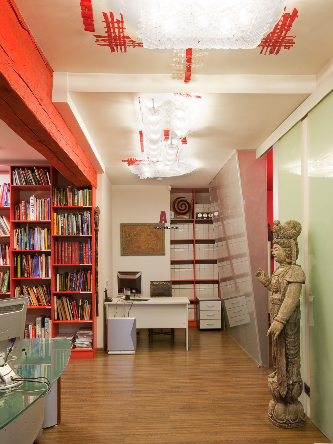 Вид от входной группы на рабочую зону. Потолочные светильники из цветного стекла в стилистике русского авангарда – авторская работа. Ламинат Alloc.