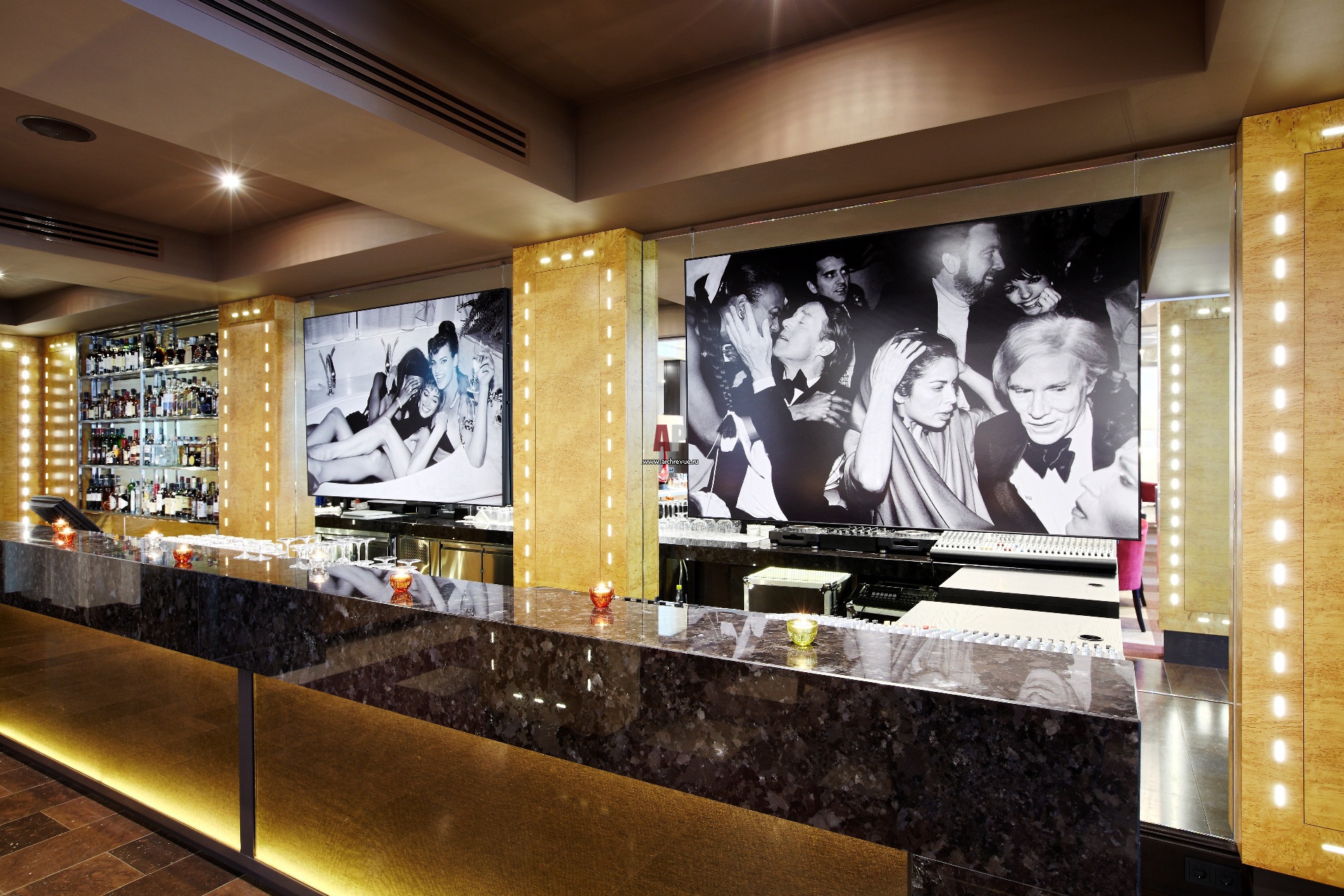 Барная стойка выполнена в сдержанном ключе. Она облицована глянцевым камнем и обшита панелями из карельской березы.