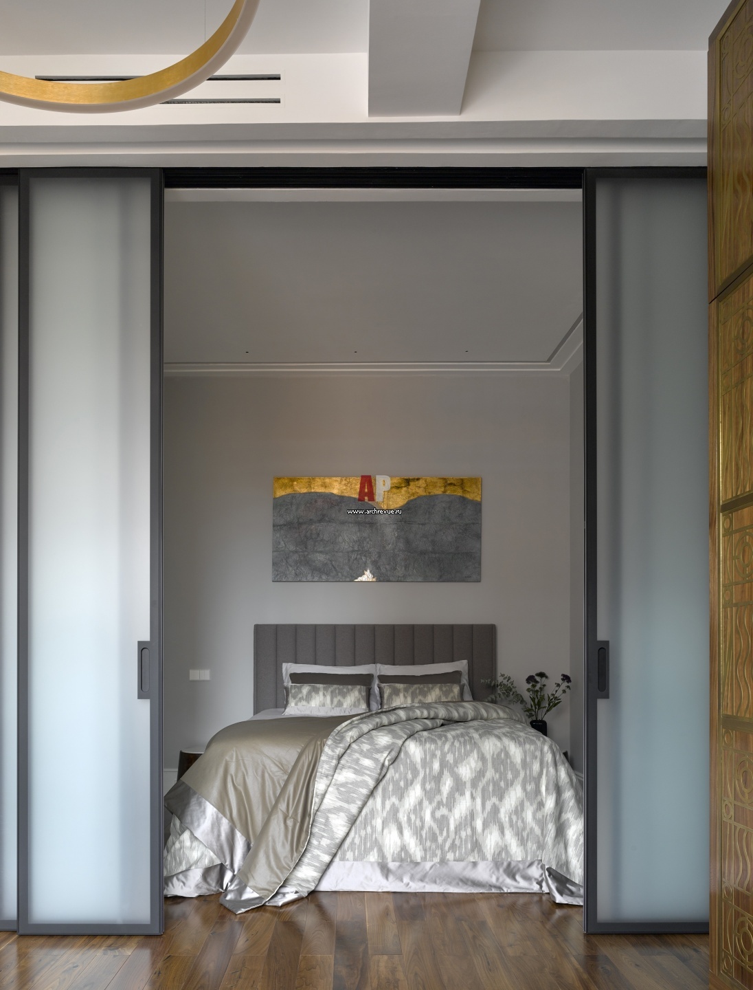 Спальня размещена в алькове и отделена от гостиной раздвижной перегородкой из полупрозрачного стекла. Кровать, Dantone Home. Тумбочки, Crate and Barrel.