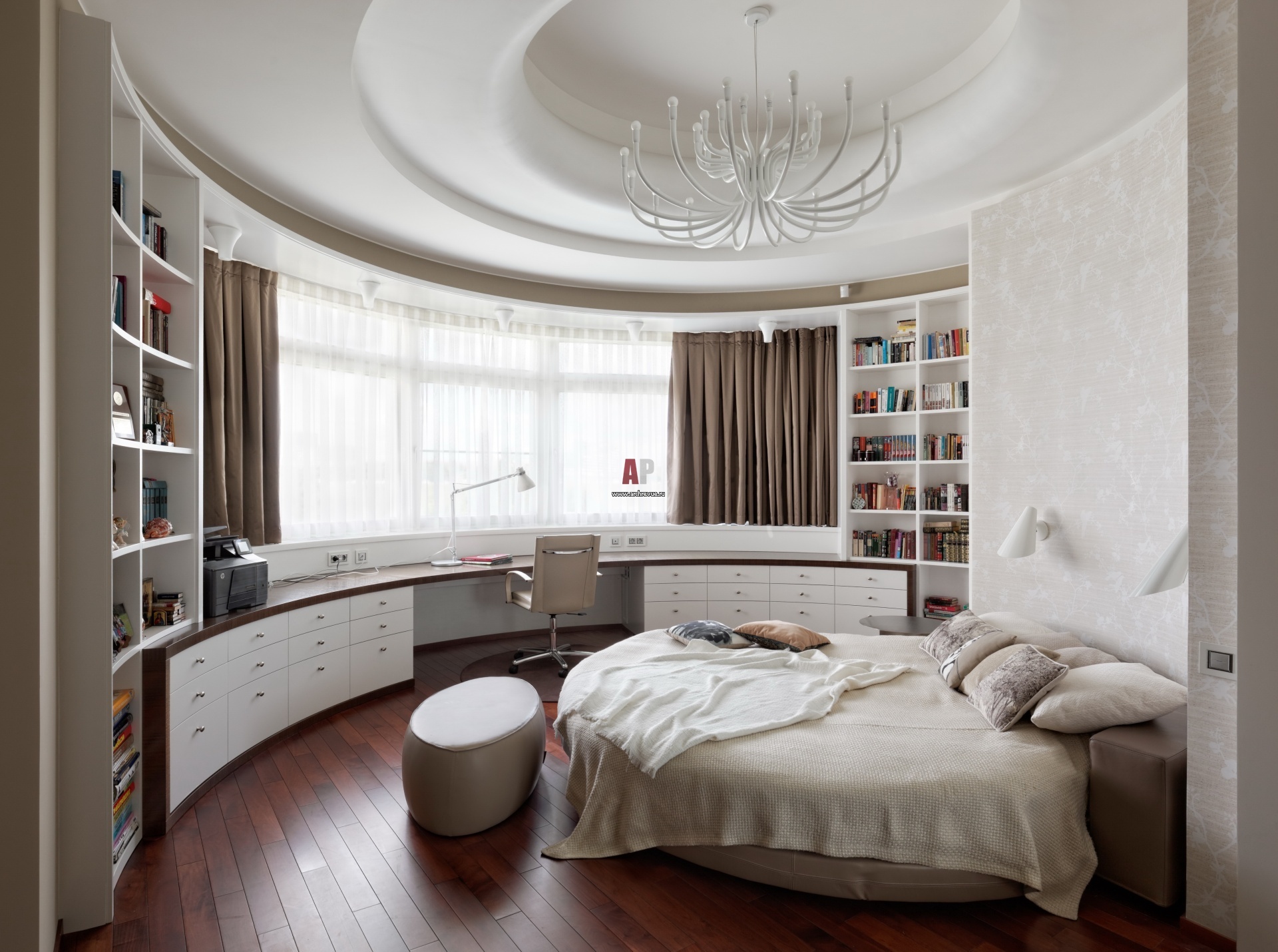 Интерьер одной из детских. В пространство под окном встроен радиусный рабочий стол, созданный на заказ. Круглая кровать, Ivano Redaelli.