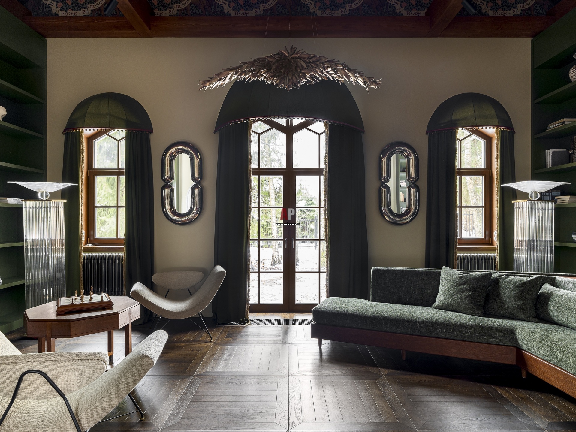 Гостиная – центр дома, помещение получилось масштабным и открытым. Из него организован выход в сад. Люстра с листьями, Vetvi Store, коллекция Evo.