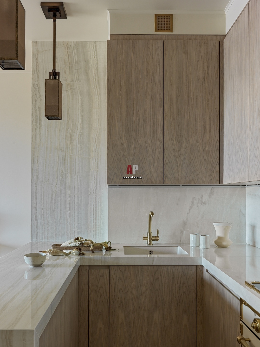 Квартира с природными фактурами и натуральной палитрой. Интерьер кухни.