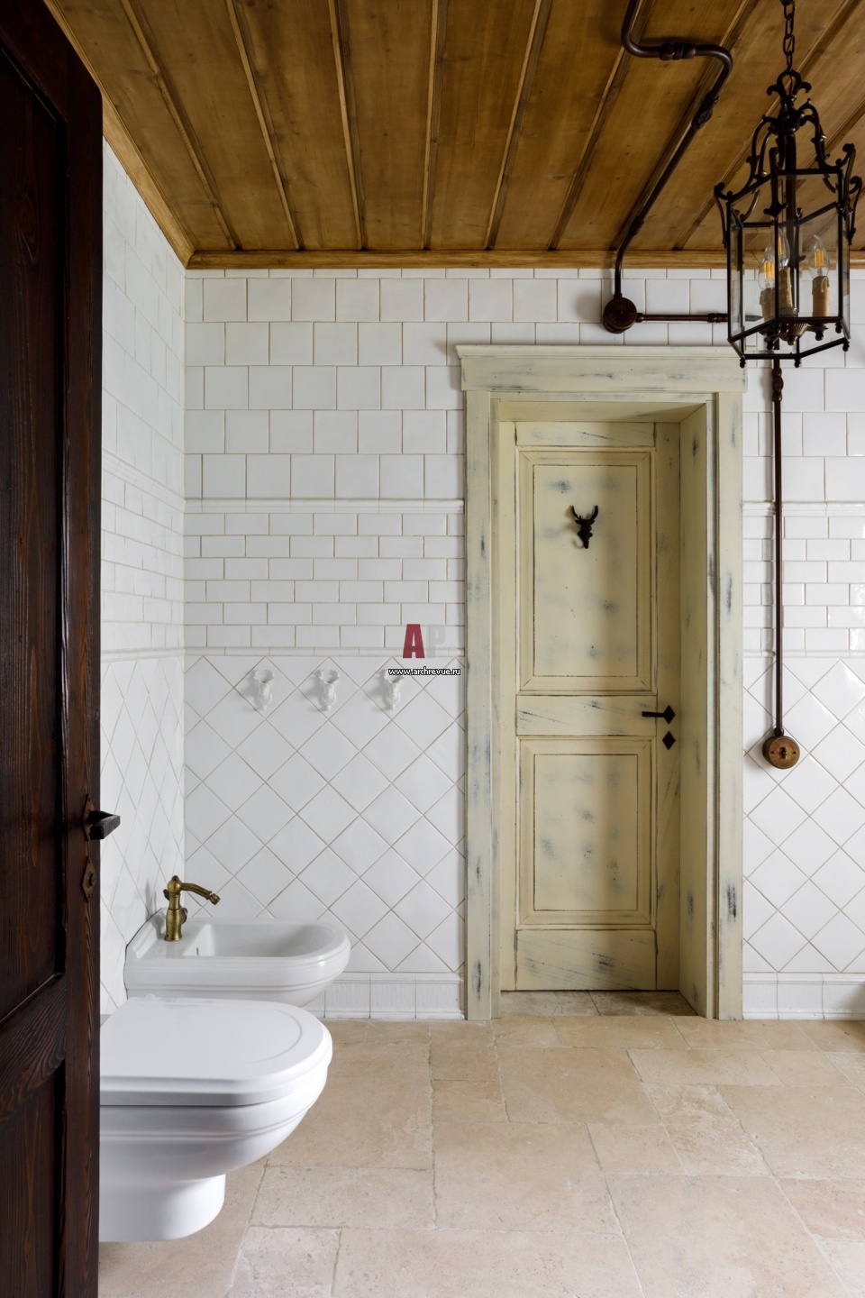 На контрасте с темной, плотно декорированной спальней решен санузел. Он белый, монохромный, все внимание сосредоточено на фактуре и сложной раскладке плитки. Санфаянс, Villeroy & Boch.