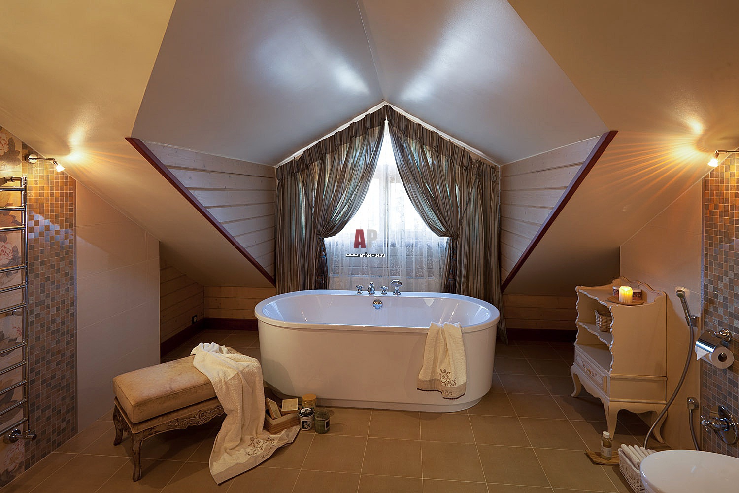 Фото интерьера ванной комнаты в деревянном доме. Чтобы увеличить высоту ванной и создать красивую конфигурацию потолка, архитектору пришлось раскрывать кровлю. Отдельностоящая ванна у окна, Villeroy & Boch.