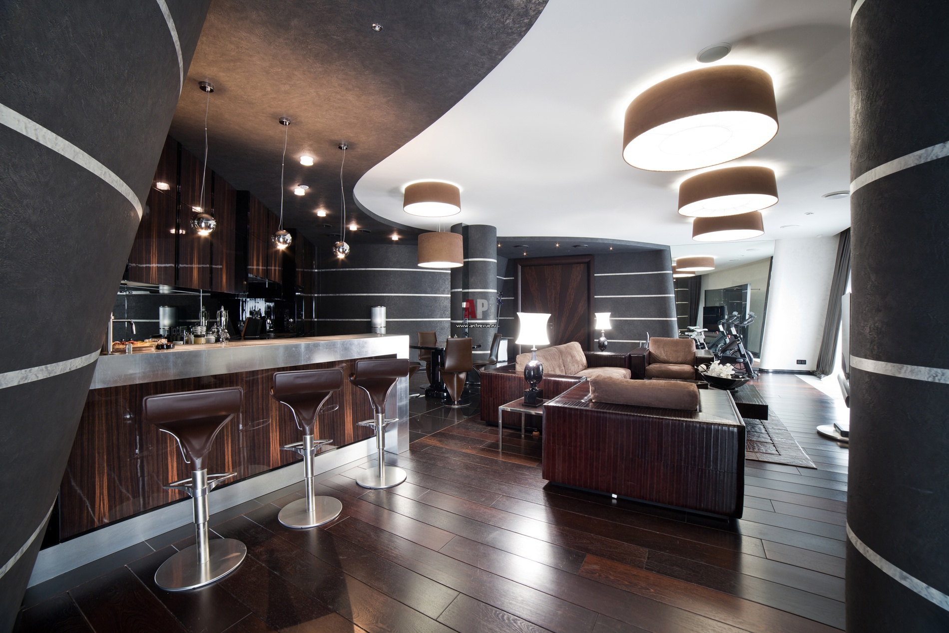 Зона бара в приватных апартаментах. Кухня Brummel Cucine из зебрано. На заднем плане – раздвижные двери из венге с инкрустацией из зебрано в виде лучей солнца, изготовление «Лигнаур».