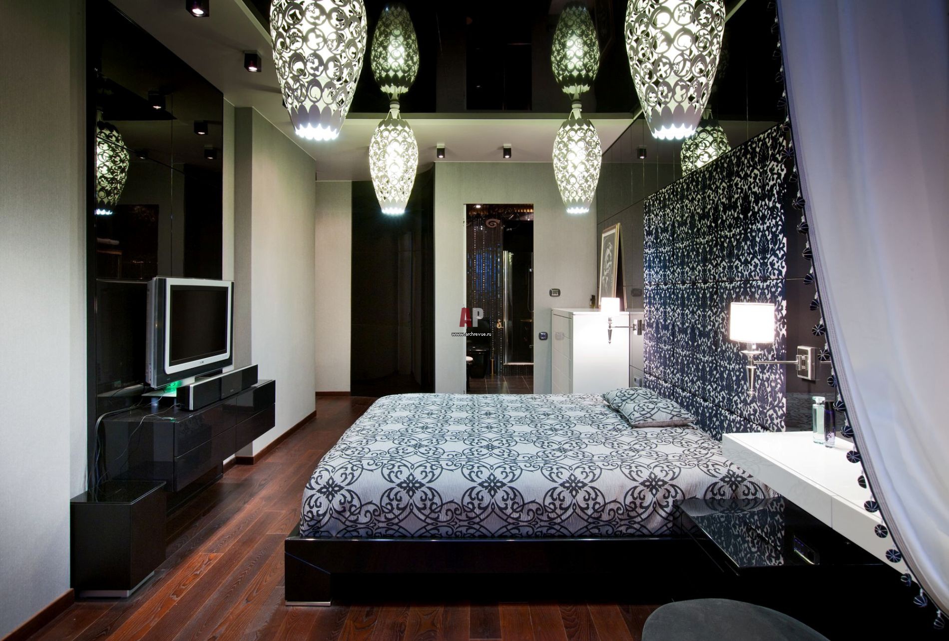 Спальня решена на контрасте черного и белого. Стены облицованы лакированными панелями Porada, изголовье кровати обито тканью с узором в духе ар-деко. Светильники Lamp International выполнены из металла, покрашенного в белый цвет.