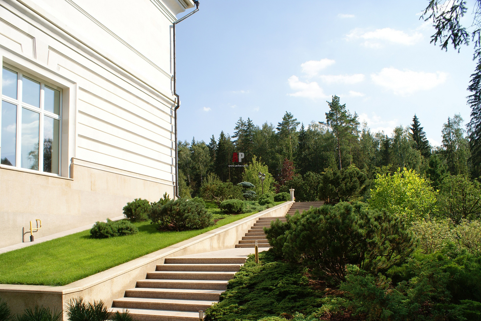 Декоративная композиция из хвойных вдоль лестницы.