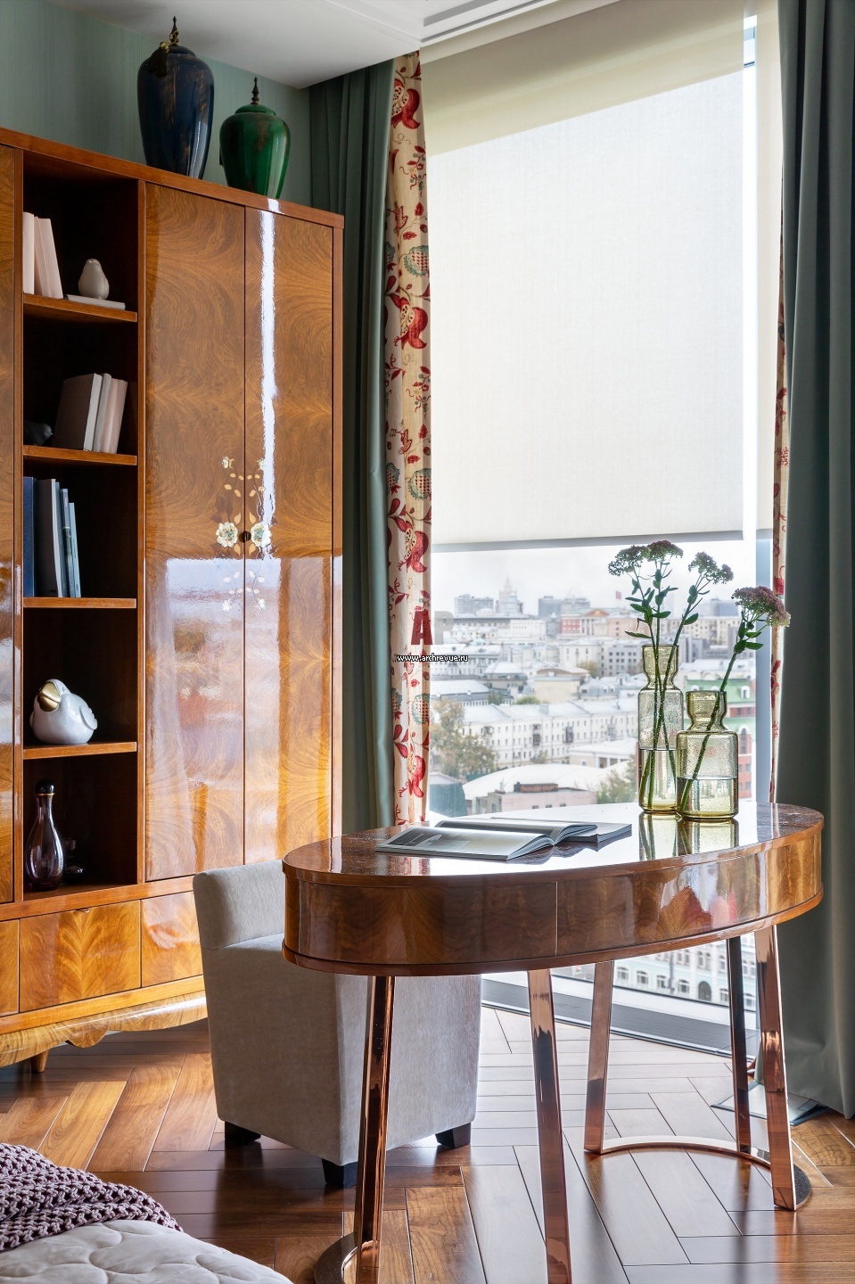 Рабочая зона в детской меблирована лакированными предметами в стиле ар-деко из шпона дерева золотисто-медового цвета.