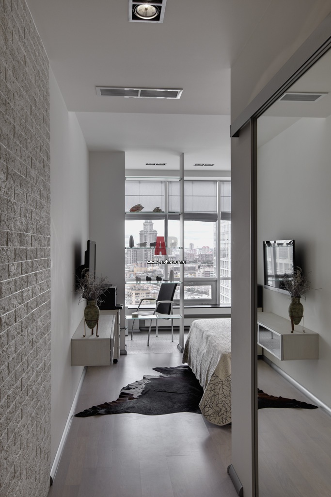 Вход в спальню. Отдельная гардеробная комната расположена в спальне. Зеркало в полный рост предваряет зону отдыха. Из панорамных окон открывается урбанистический вид на Москву.