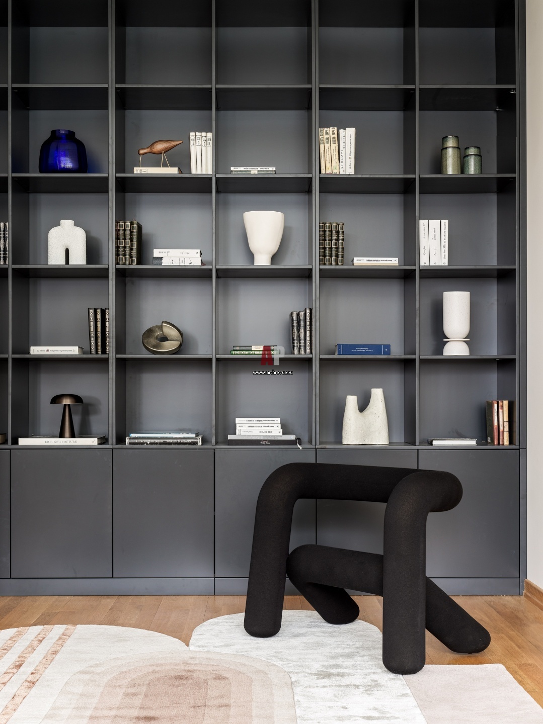 Встроенный стеллаж в кабинете жены оформлен на контрасте с молочно-белыми стенами и выкрашен в графитовый цвет.