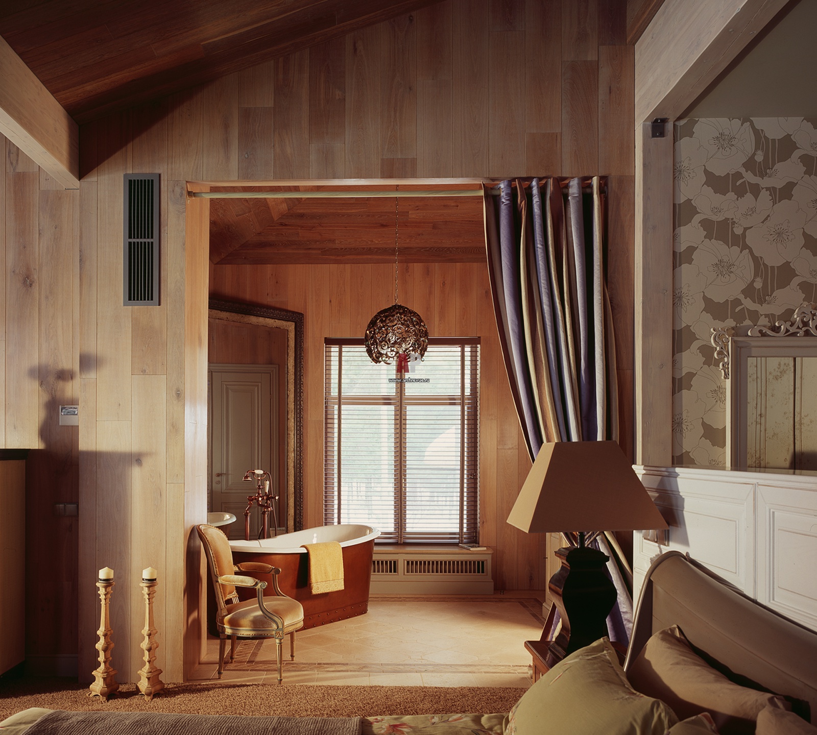 Ванна интегрирована в пространство спальни, она создает атмосферу роскоши и неги. Напротив нее – дверь в санузел, где есть душевая кабина.