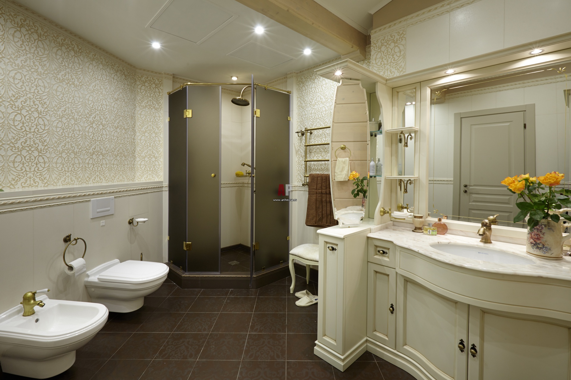 Интерьер хозяйской ванной в золотистой цветовой гамме. На стенах – рельефные обои- линкруста с золочением.