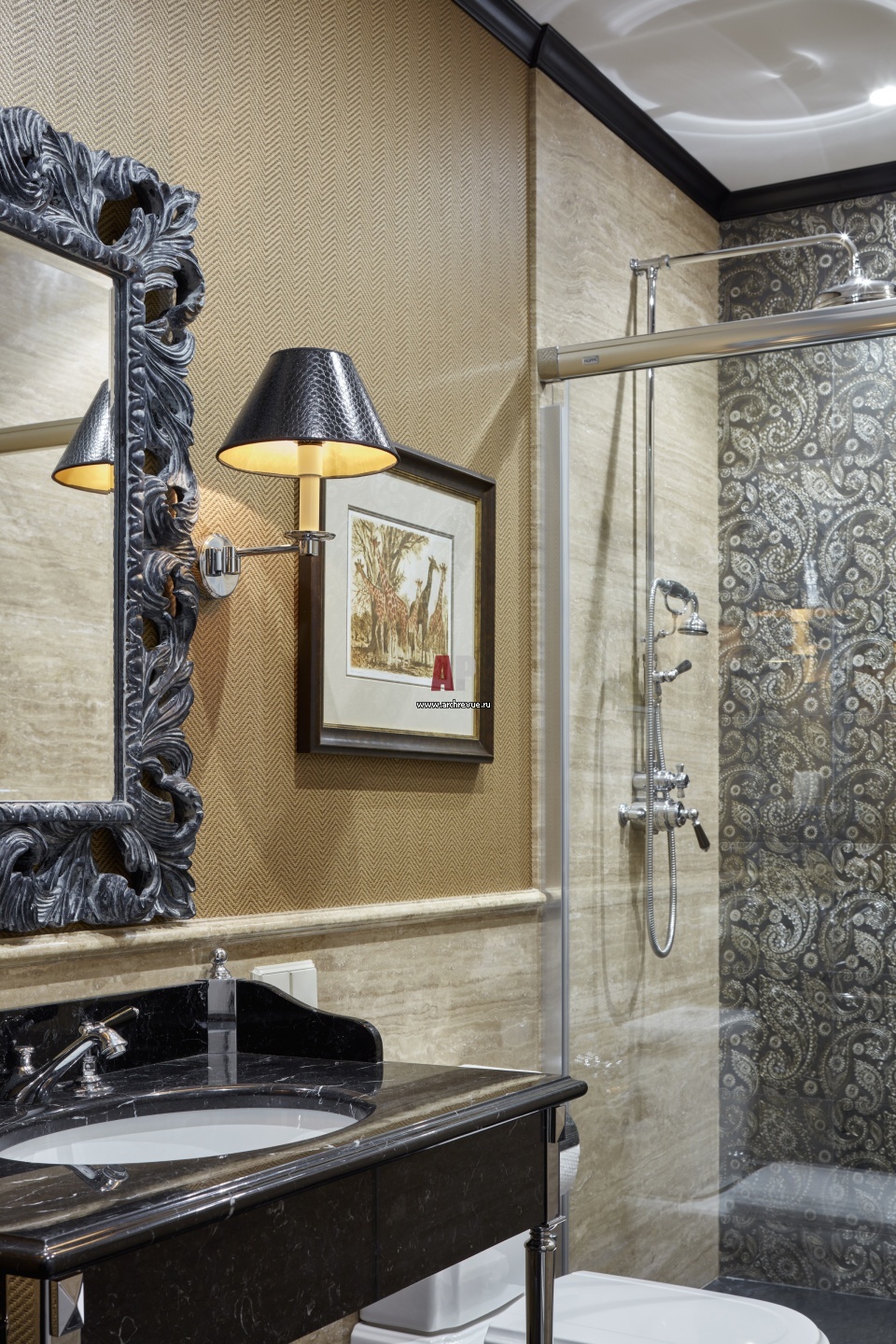 Интерьер гостевого санузла на первом этаже. Стены облицованы мрамором, покрытым тонкой резьбой и серебряной патиной.