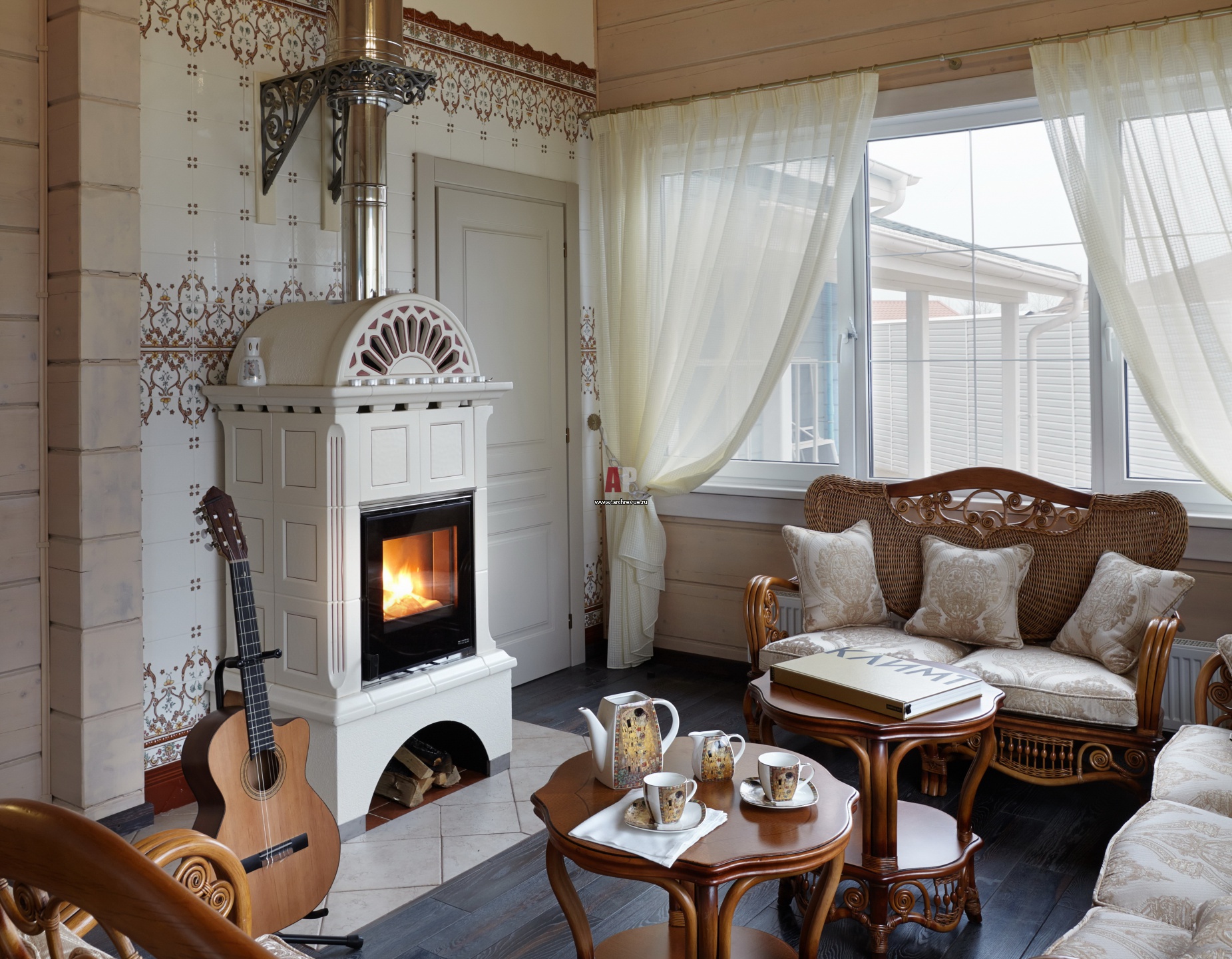 Каминная группа с зоной отдыха в доме из бруса. Дровяная печь исполнена в белой керамике. Стена за ней облицована белой керамической плиткой с росписью, имитирующей изразцы.