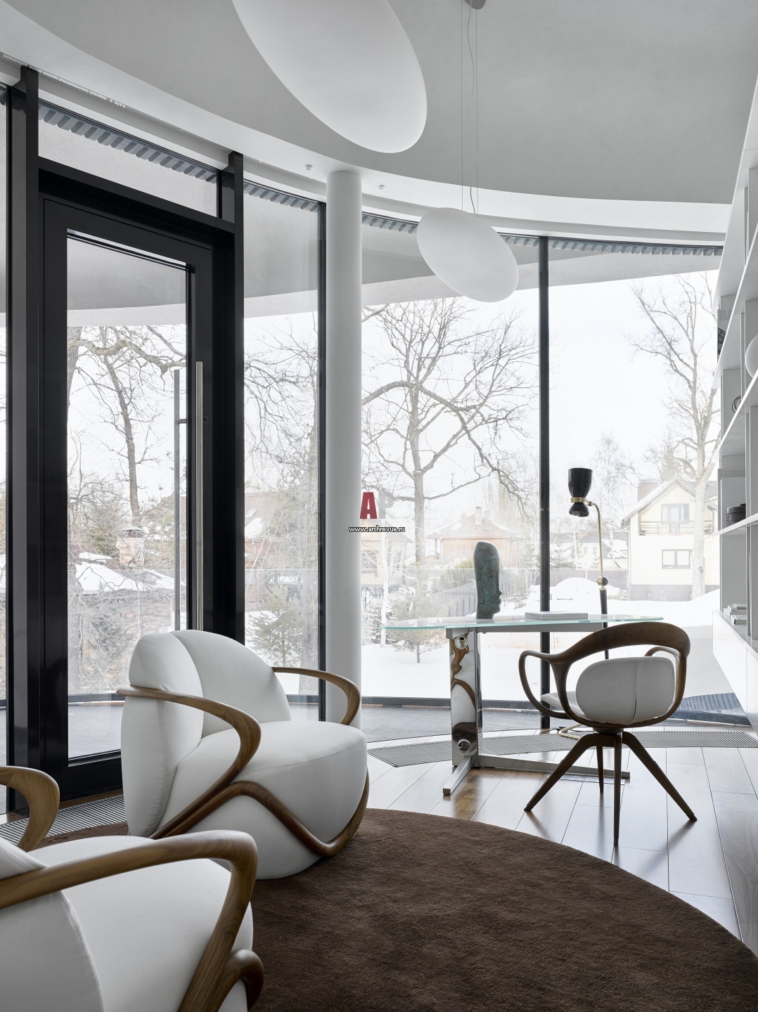 В кабинете есть балкон с видом на пруд, переливной бассейн и весь участок. Письменный стол, Cattelan Italia. Стулья и кресла, Giorgetti.