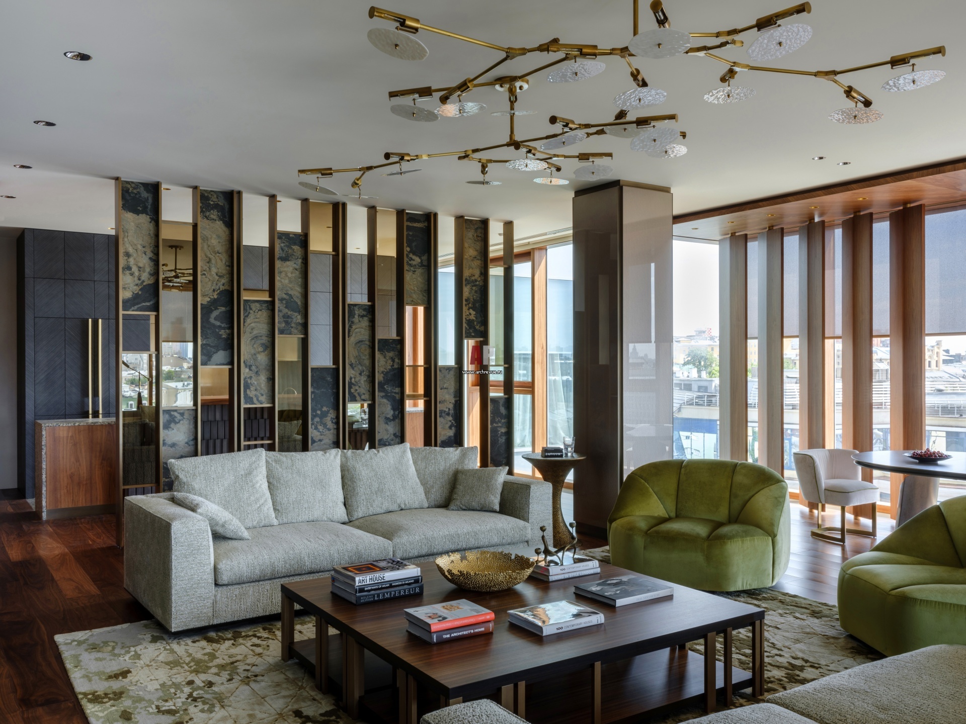 Гостиная. Перегородка между кухней и гостиной из латуни и камня. Колонны облицованы МДФ в отделке жидкий металл с эффектом бронзированной латуни и декоративным стеклом. Диван, Minotti в обивке тканью Pierre Frey. Журнальные столики, Emmemobili. Придиванный столик, Hamilton Conte.