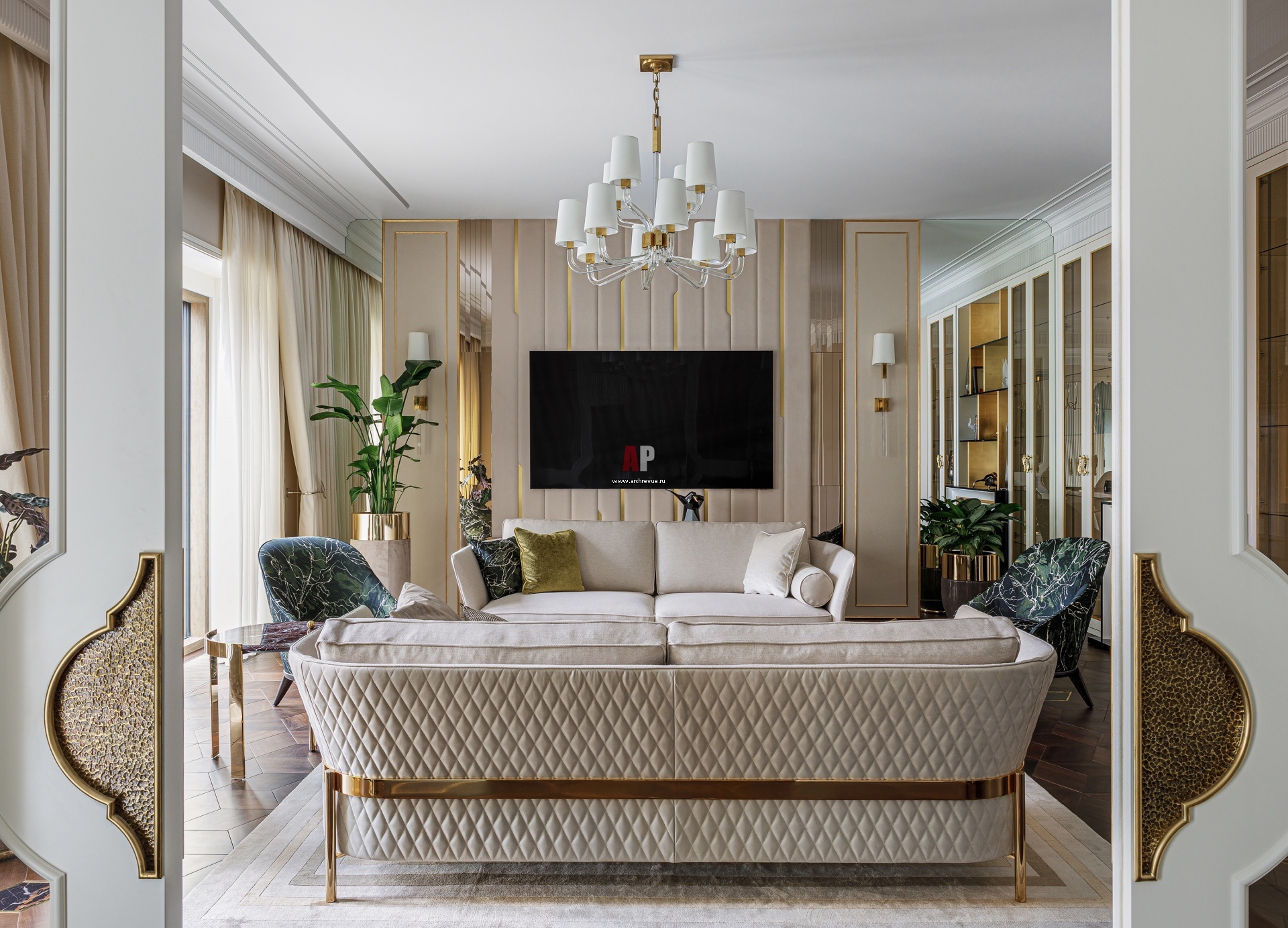 Стеновая панель для ТВ с оформлена декоративным замшевым покрытием и вставками из латуни и зеркал. Двери и стеллаж с камином изготовлены по эскизам автора проекта.