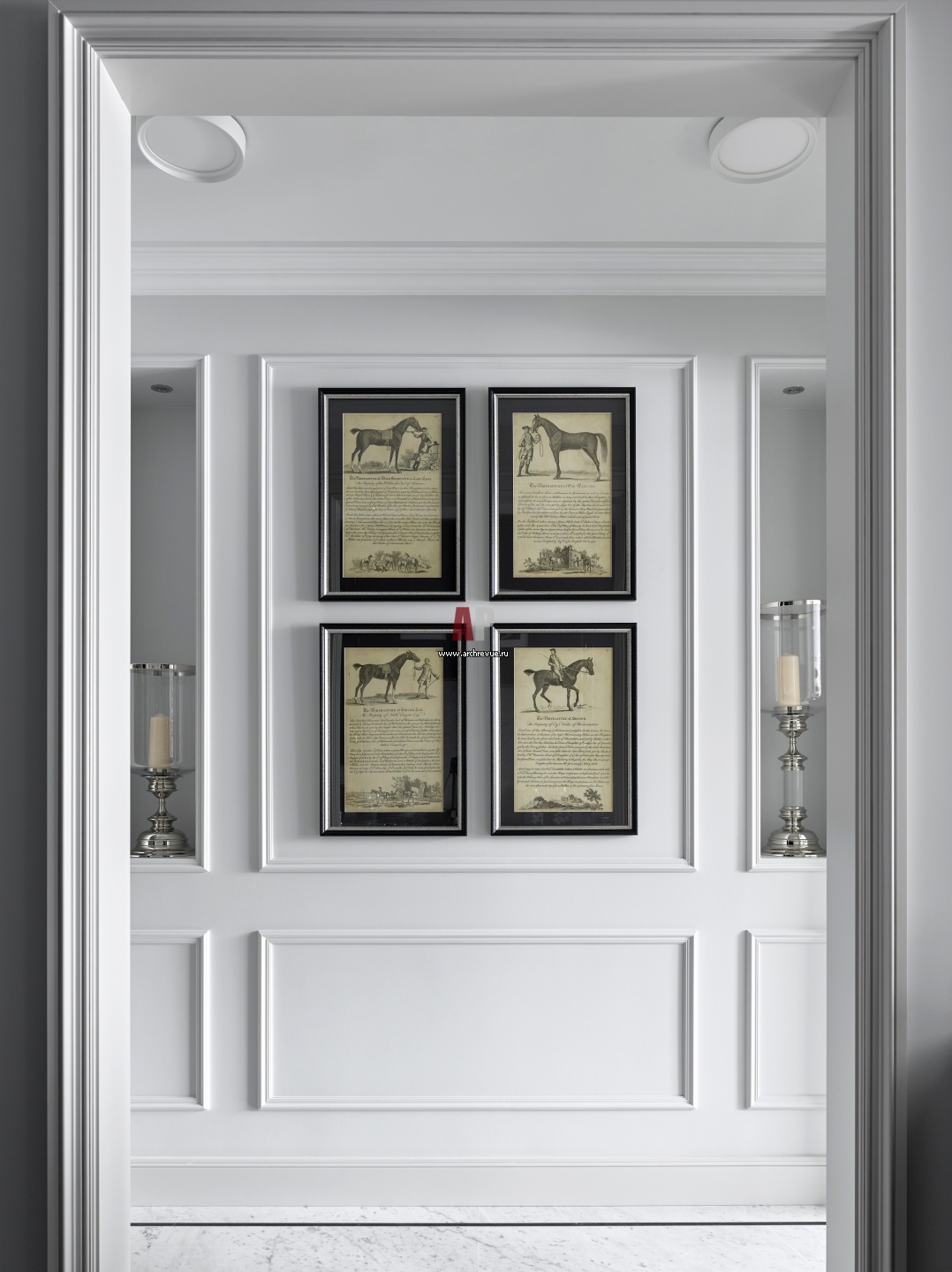 Интерьер прихожей. Белые стены оформлены гравюрами с изображением лошадей. Подсвечники, Global Views.