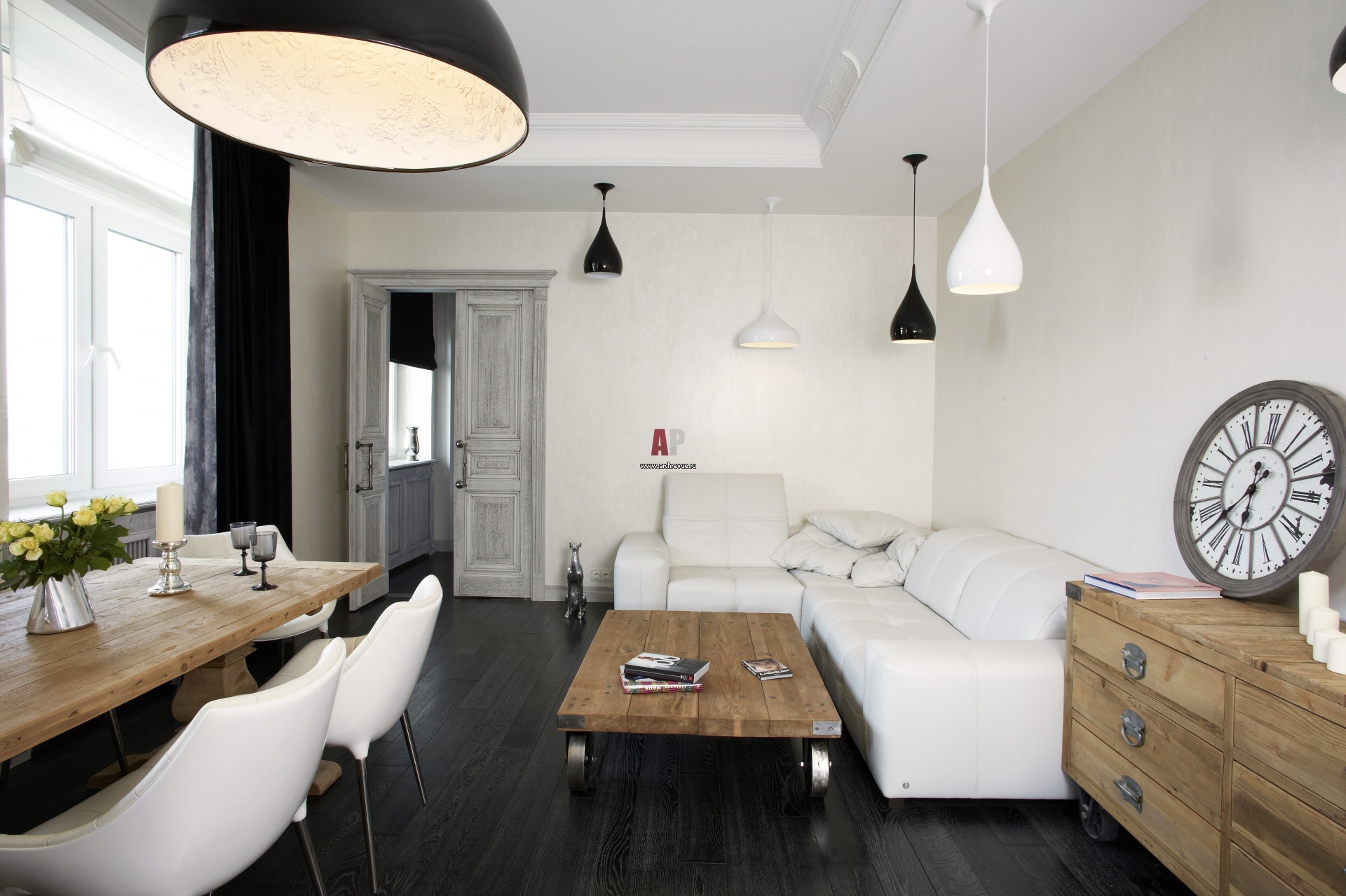 Интерьер выглядит монохромным и словно овеянным серебристой дымкой, мебель в стиле шебби шик создает ощущение родового семейного жилья. В то же время ультрасовременные светильники, кресла-коконы из пластика, двери из черного стекла на металлических болтах – примета дня сегодняшнего.